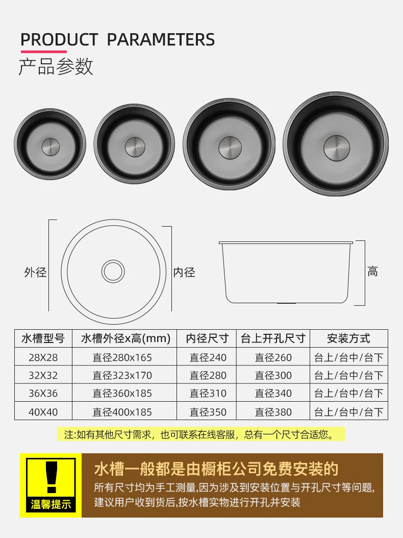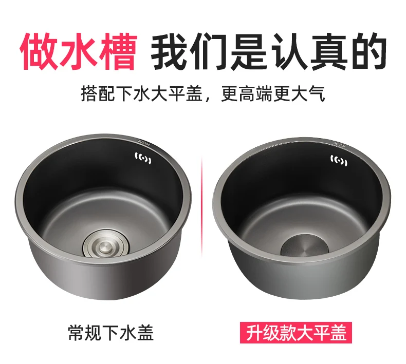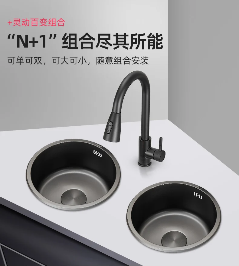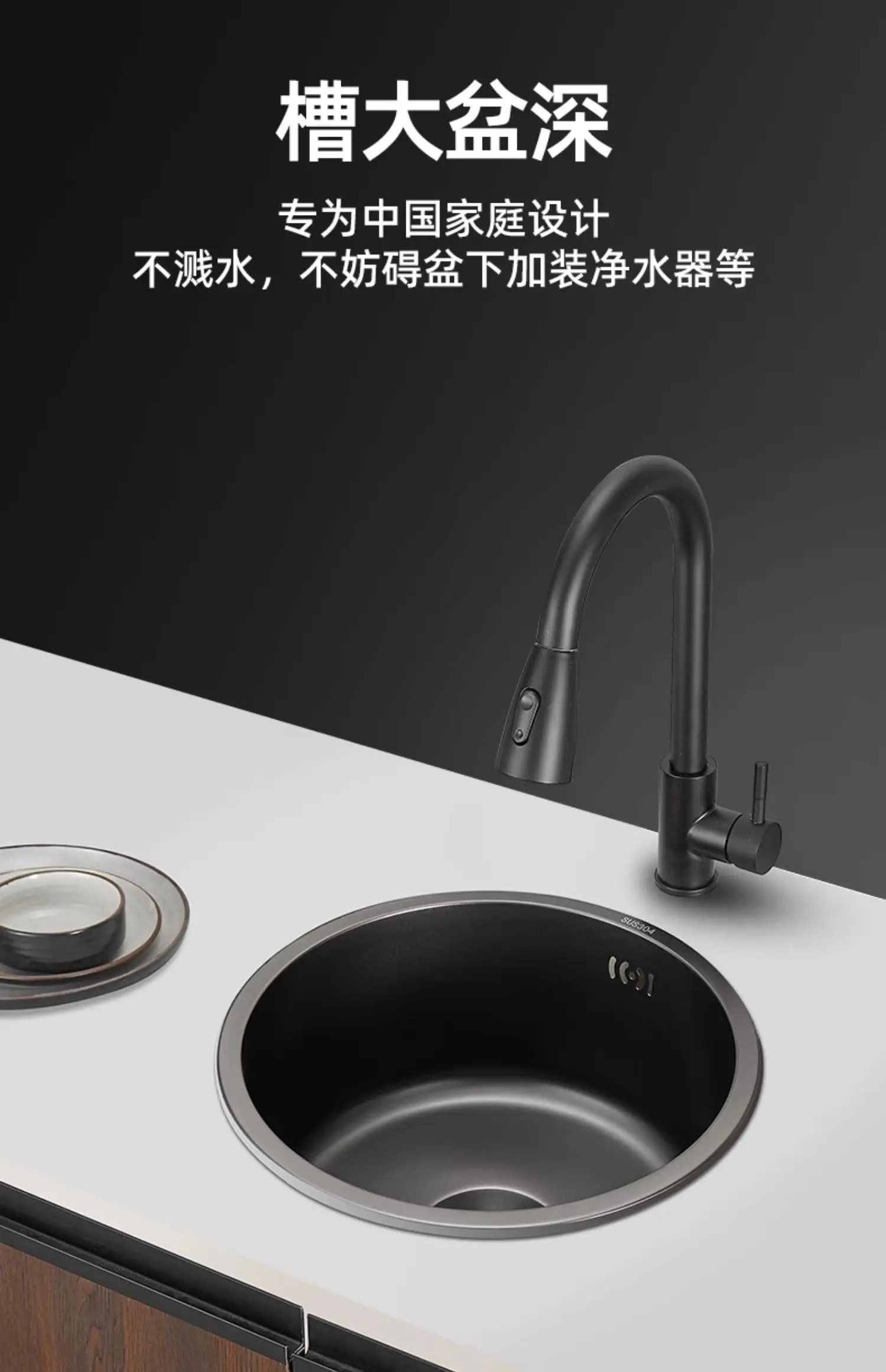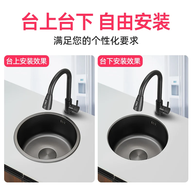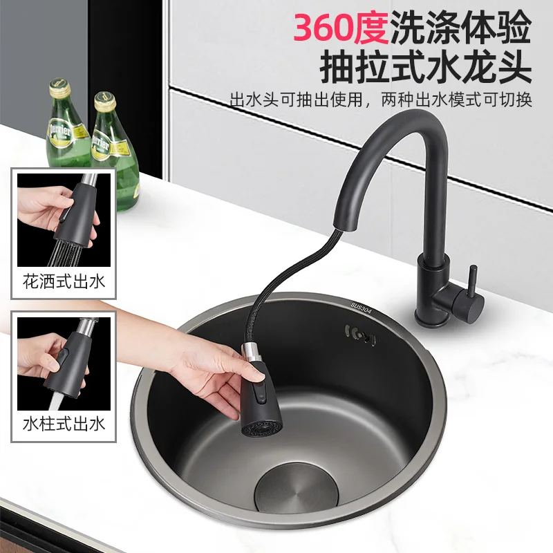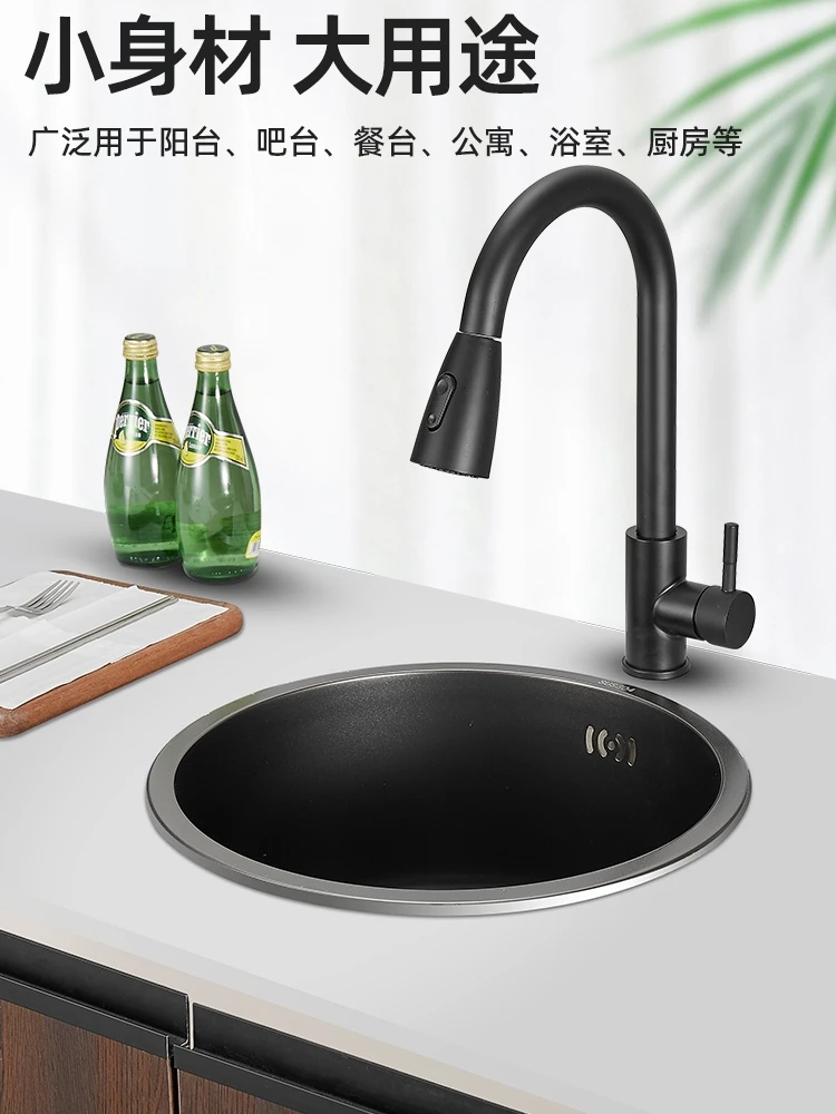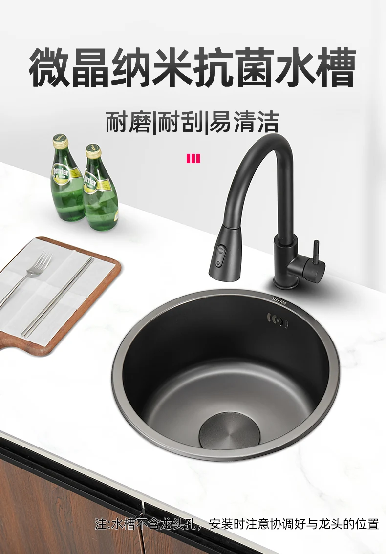 อ่างล้างจานเดี่ยวกลมนาโนสีดํา 304 บาร์สแตนเลสระเบียงเกาะห้องครัวขนาดเล็กใต้อ่างล้างจานเคาน์เตอร์