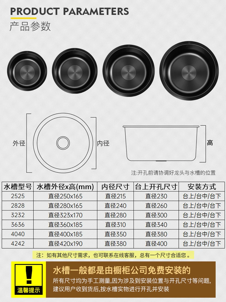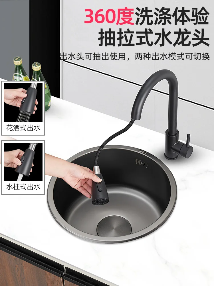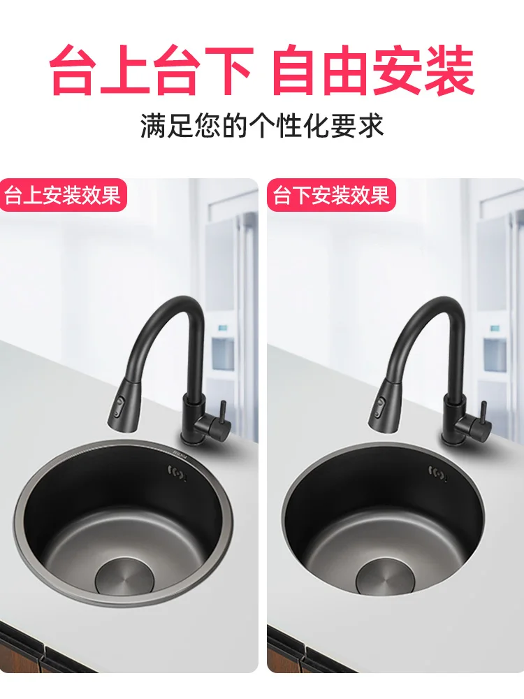 อ่างล้างจานเดี่ยวกลมนาโนสีดํา 304 บาร์สแตนเลสระเบียงเกาะห้องครัวขนาดเล็กใต้อ่างล้างจานเคาน์เตอร์