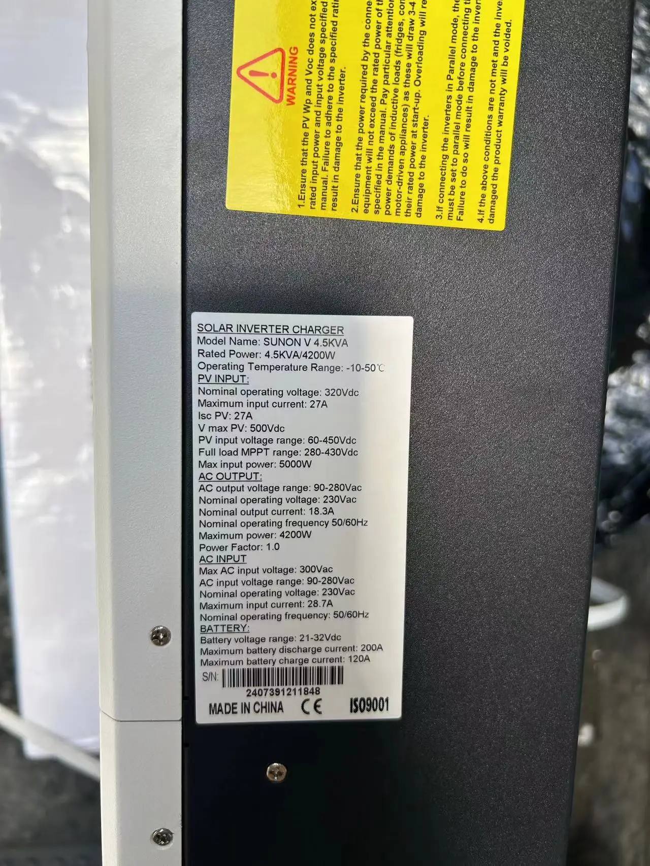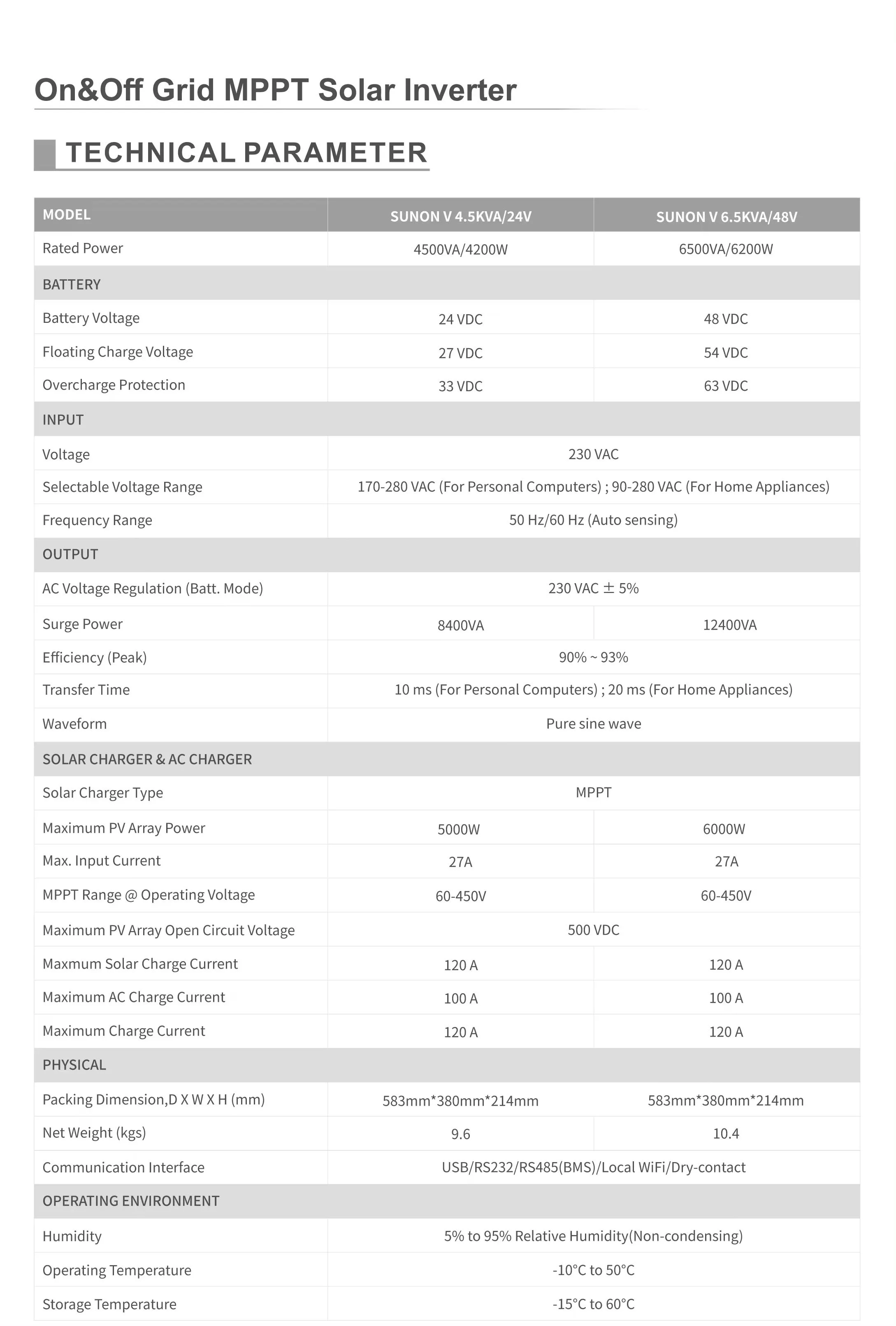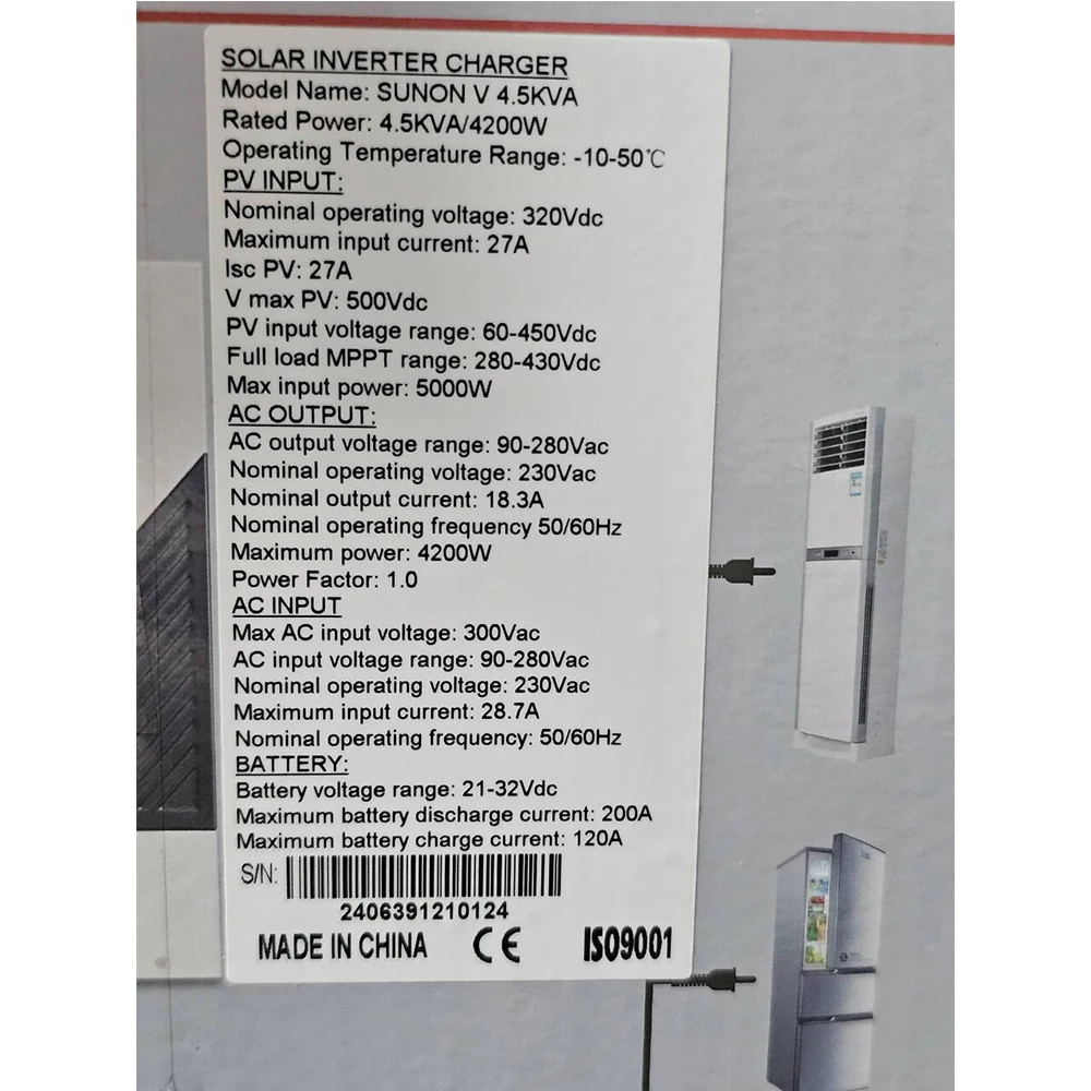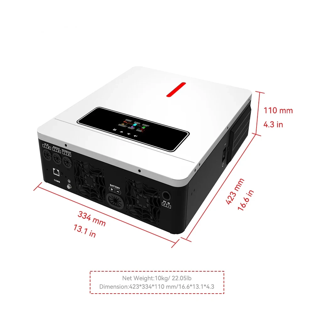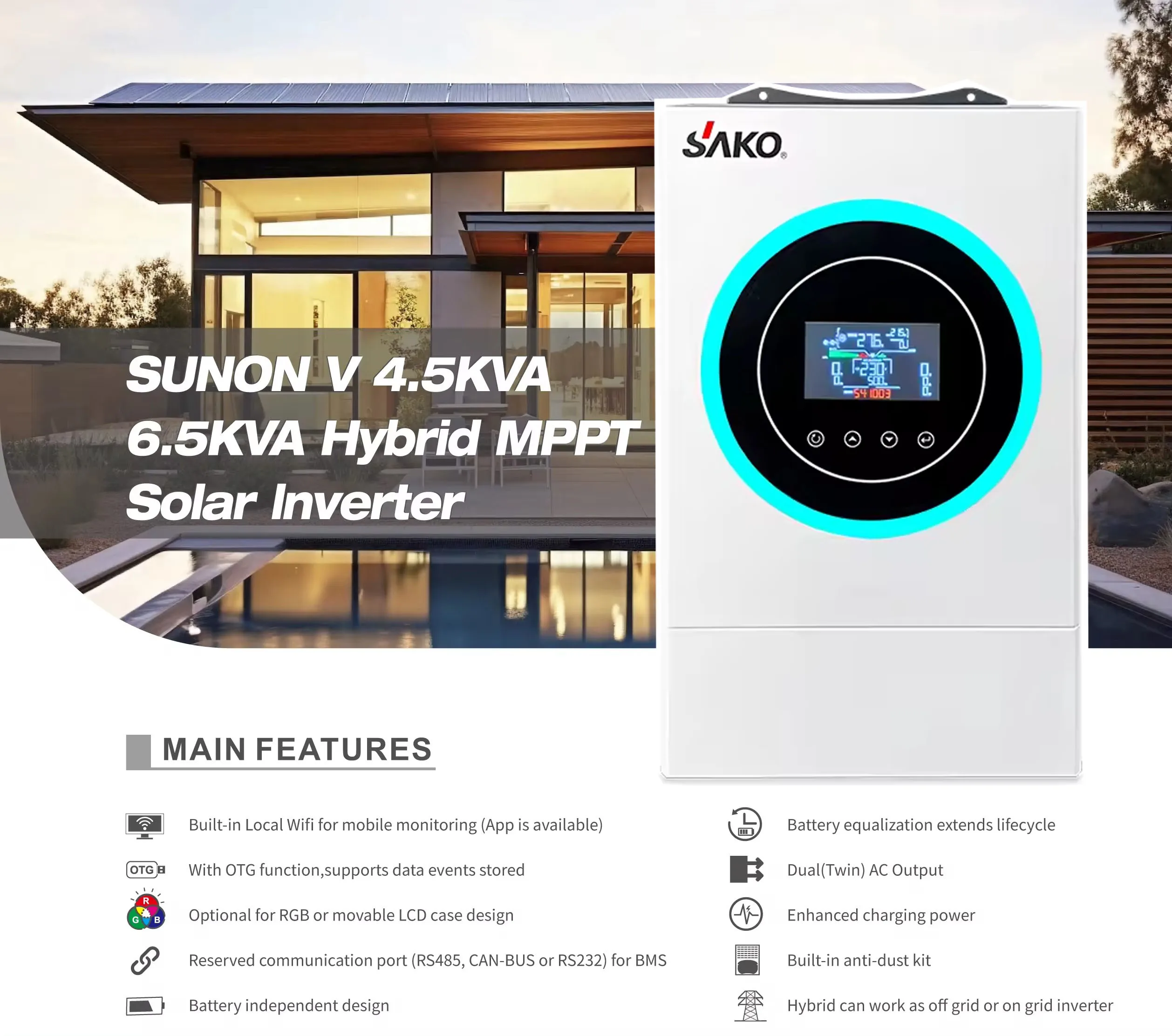 Sako Sunon V 4.5KVA/4.2Kw ตัวควบคุมพลังงานแสงอาทิตย์ MPPT 120A ในตัวอินพุต PV 60-450vdc ทำงานไม่มีแบตเตอรี่เปิดและปิดกริดคลื่นไซน์บริสุทธิ์