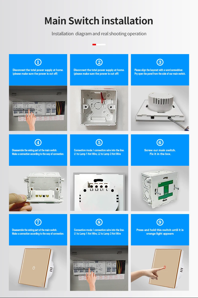 8, การควบคุมสายไฟเดี่ยว, ติดตั้งง่าย, เปลี่ยนสวิตช์เก่าโดยตรง