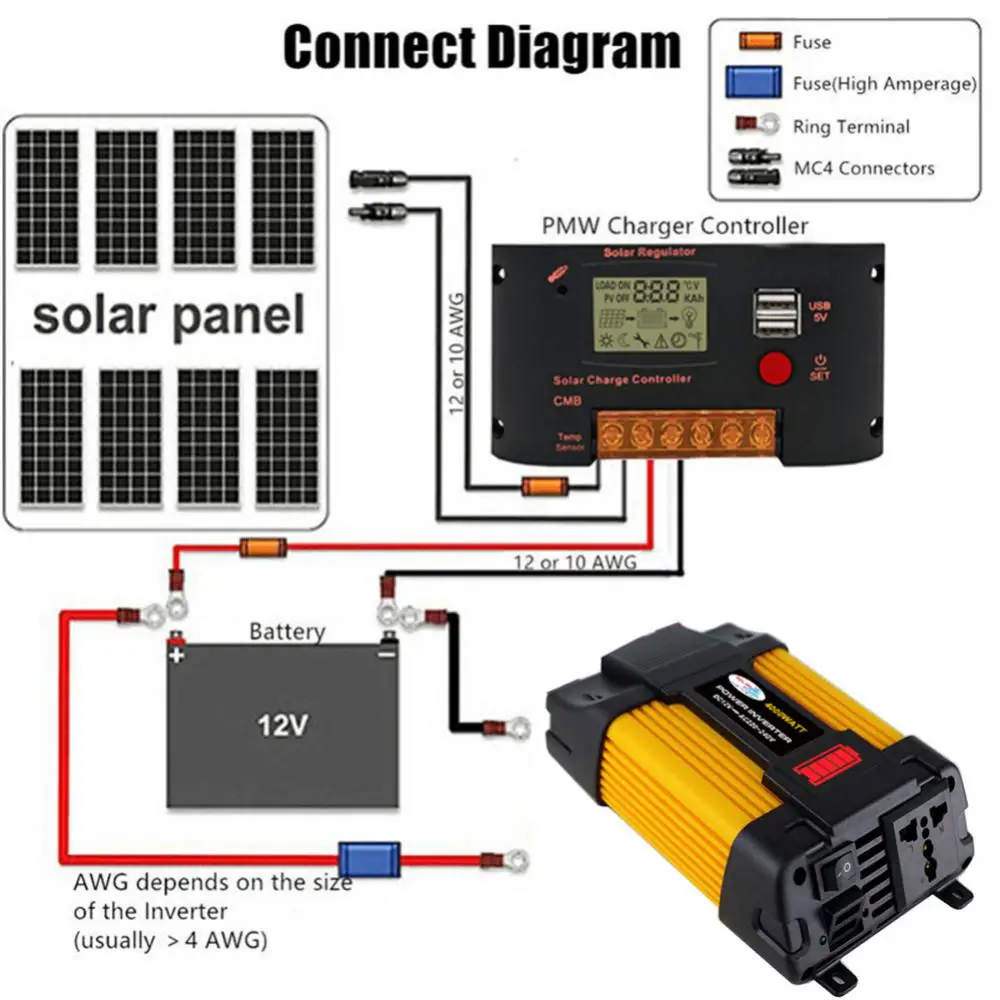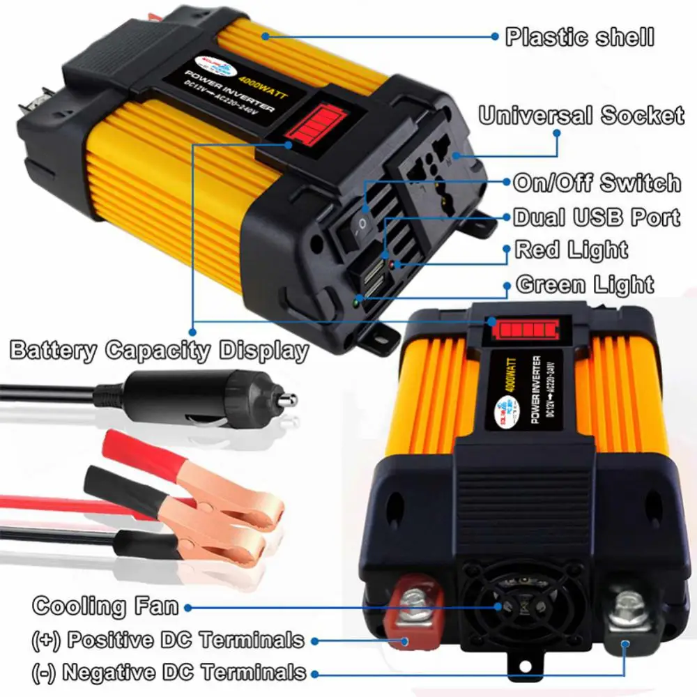 [อินเวอร์เตอร์จ่ายไฟ4000W/6000W] อินเวอร์เตอร์ไฟฟ้าในรถยนต์พร้อมพอร์ต USB 2พอร์ตและเต้าเสียบ ไฟกระชาก: 4000W/6000W อินเวอร์เตอร์ไฟฟ้ามาพร้อมกับที่จุดบุหรี่ฟรีและที่หนีบแบตเตอรี่2ชิ้นให้พลังงานต่อเนื่อง300วัตต์/500วัตต์กำลังไฟสูงสุด4000วัตต์/6000วัตต์ (โปรดตรวจสอบให้แน่ใจว่ากำลังไฟทั้งหมดของอุปกรณ์ที่เชื่อมต่ออยู่ที่ ≤ 300W/500W)