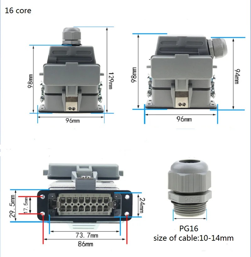 ข้อมูลจําเพาะของยุโรป 10-16 ขั้วต่อสําหรับงานหนักขนาดเล็ก HA Ue250V Ie 16A