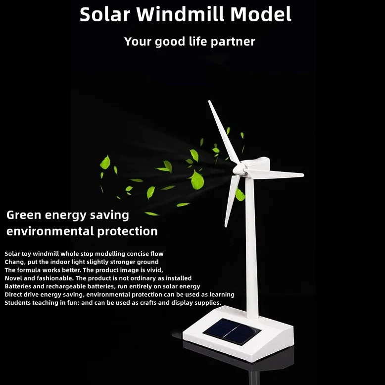กังหันลมพลังงานแสงอาทิตย์นี้เป็นผลิตภัณฑ์ DIY โดยใช้แผงโซลาร์เซลล์ซิลิคอนคริสตัลที่แข็งแกร่งเป็นพลังงานสินค้าแบ่งออกเป็นสามส่วน: ฐาน ก้านสูบ และใบพัดลมภายใต้แสงแดด เซลล์แสงอาทิตย์จะแปลงพลังงานแสงเป็นไฟฟ้าเพื่อหมุนใบมีดโมเดลกังหันลมของเล่นพลังงานแสงอาทิตย์ รูปทรงโดยรวมเรียบง่ายและเรียบเนียนภาพผลิตภัณฑ์มีความสดใส แปลกใหม่ และทันสมัยผลิตภัณฑ์ไม่ได้ติดตั้งแบตเตอรี่ธรรมดาและแบตเตอรี่แบบชาร์จไฟได้โดยอาศัยพลังงานแสงอาทิตย์ขับเคลื่อนโดยตรงประหยัดพลังงานรักษาสิ่งแวดล้อมสามารถใช้เป็นนักเรียนสอนความบันเทิง; ยังสามารถใช้เป็นศิลปะและงานฝีมือได้อีกด้วย