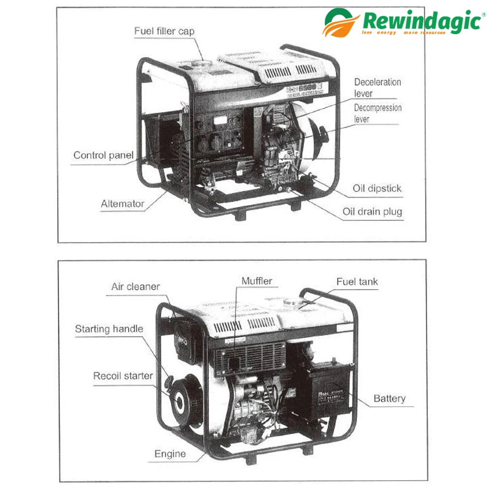 3. BE CARE NOT TO BE SCALDEDThe muffler and the engine body are very hot while the engine is running or just after running, donot touch these parts to prevent from being scalded. 4. ELECTRIC SHOCKS, SHORT CIRCUITSTo avoid electric shocks or short circuits, do not touch the generating set when your handsarewet. This generating set is not waterproof, so it should not be used in a place exposedtorainsnow or water sprays. Use of the generating set tor in a wet plae can cause short circuitsandelectric shocks during operation.