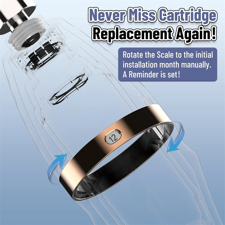 【การแจ้งเตือนการเปลี่ยน】การออกแบบวงแหวนแบบบอกเวลาที่ชัดเจนทำหน้าที่เป็นตัวแจ้งเตือนด้วยสายตาและแจ้งเตือนคุณเมื่อถึงเวลาเปลี่ยนไส้กรองน้ำ ระบบนี้ช่วยให้มั่นใจได้ว่าคุณเพลิดเพลินกับน้ำที่ปลอดภัยและผ่านการกรองอย่างต่อเนื่องโดยไม่ต้องยุ่งยากในการคาดเดา