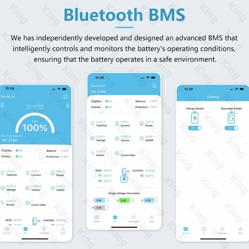 ด้วยระบบ BMS คุณภาพสูงที่ติดตั้งในตัว แบตเตอรี่มีการป้องกันการชาร์จเกิน การคายประจุเกิน กระแสไฟเกิน การลัดวงจร และการปรับสมดุลการชาร์จด้วยระบบตรวจจับและป้องกันอัตโนมัติ