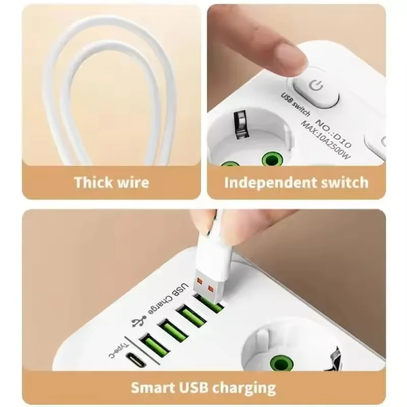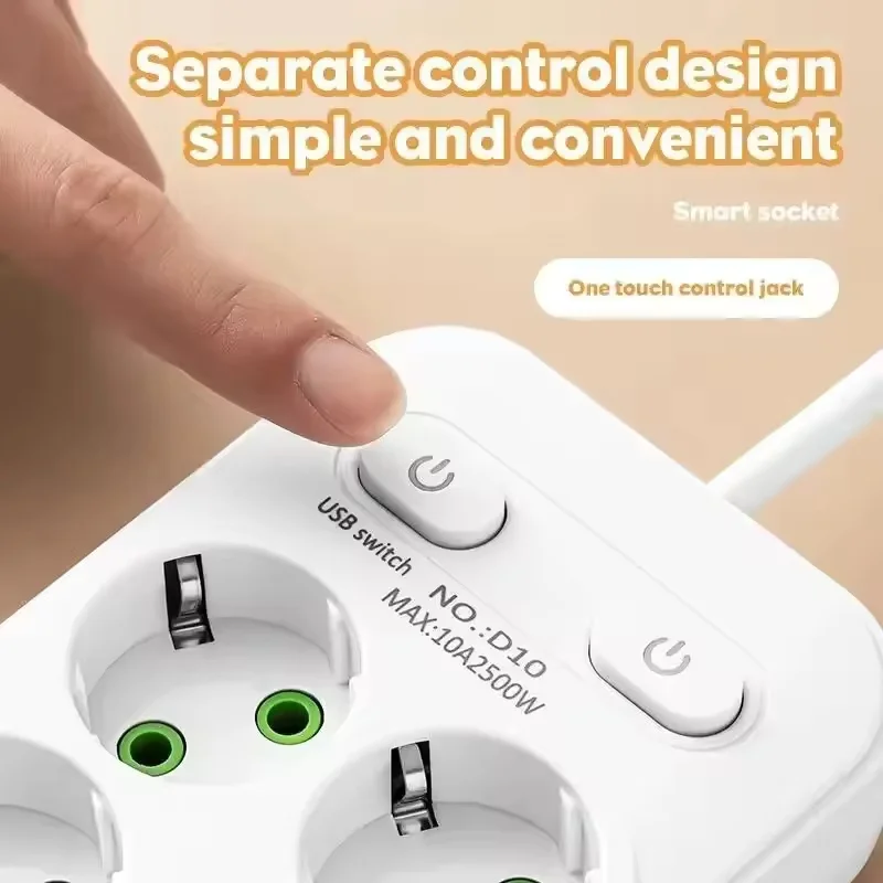ปลั๊กไฟแบบ EU พร้อมรางปลั๊กหลายช่อง สายยาว 2 เมตร ปลั๊กไฟอัจฉริยะพร้อมพอร์ต USB สำหรับบ้านและสำนักงาน ป้องกันไฟกระชากและกรองสัญญาณ