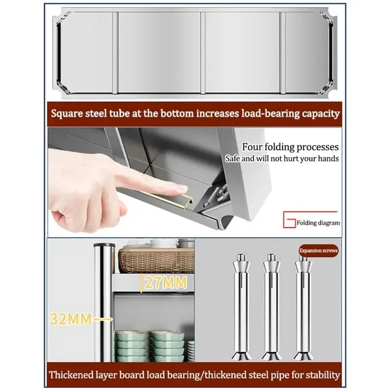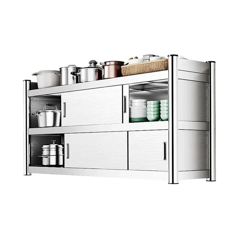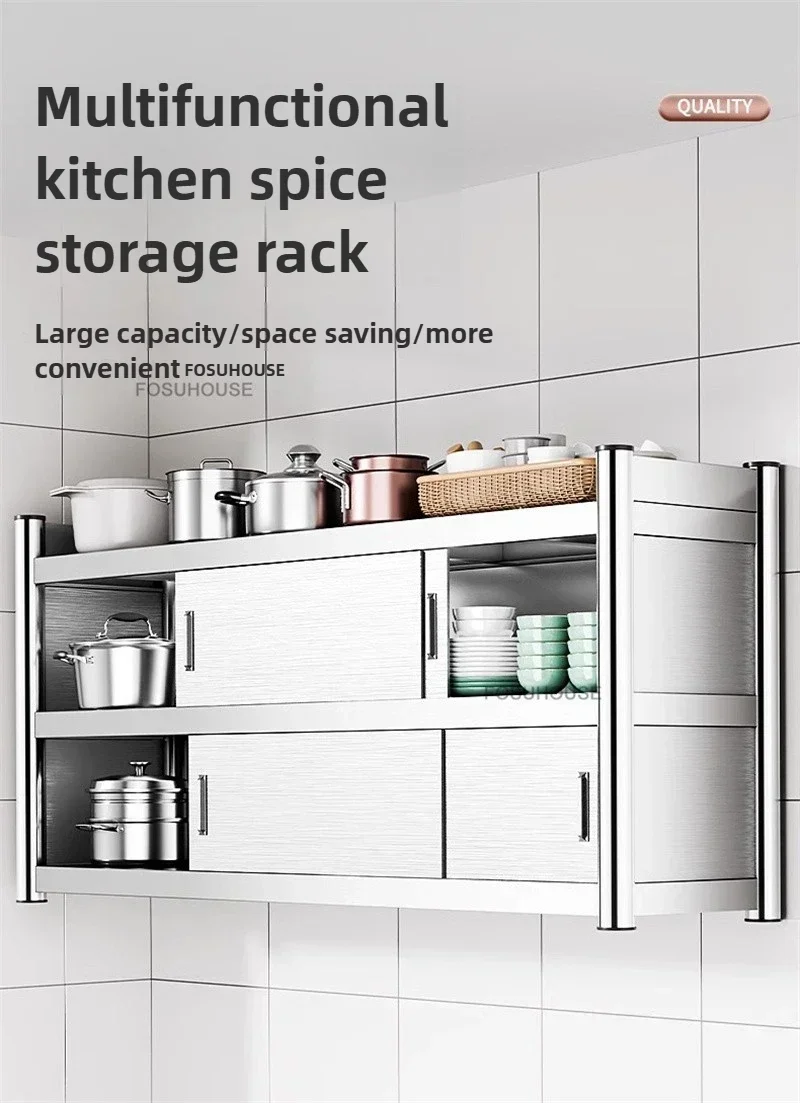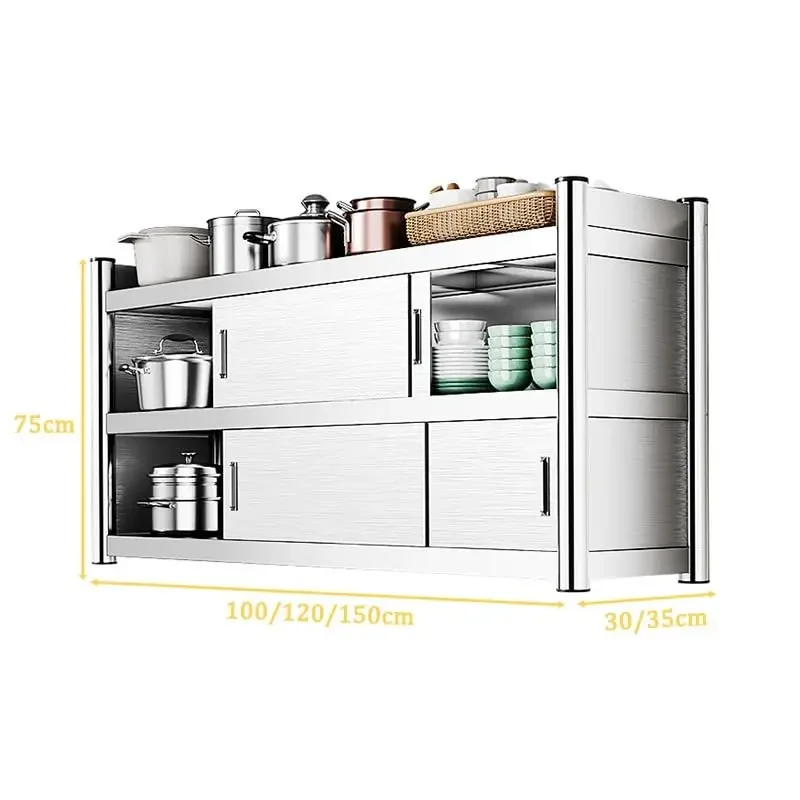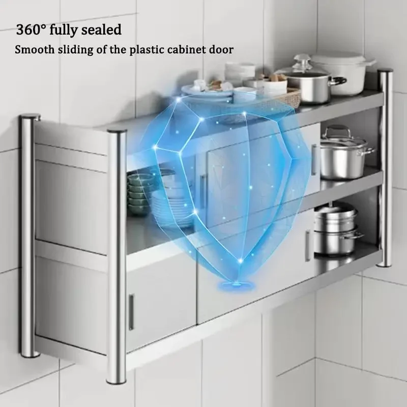 ตู้ครัวติดผนังสแตนเลสพร้อมประตูบานเลื่อน ชั้นวางของแข็งแรงทนทาน สำหรับใช้ในบ้านหรือร้านค้า