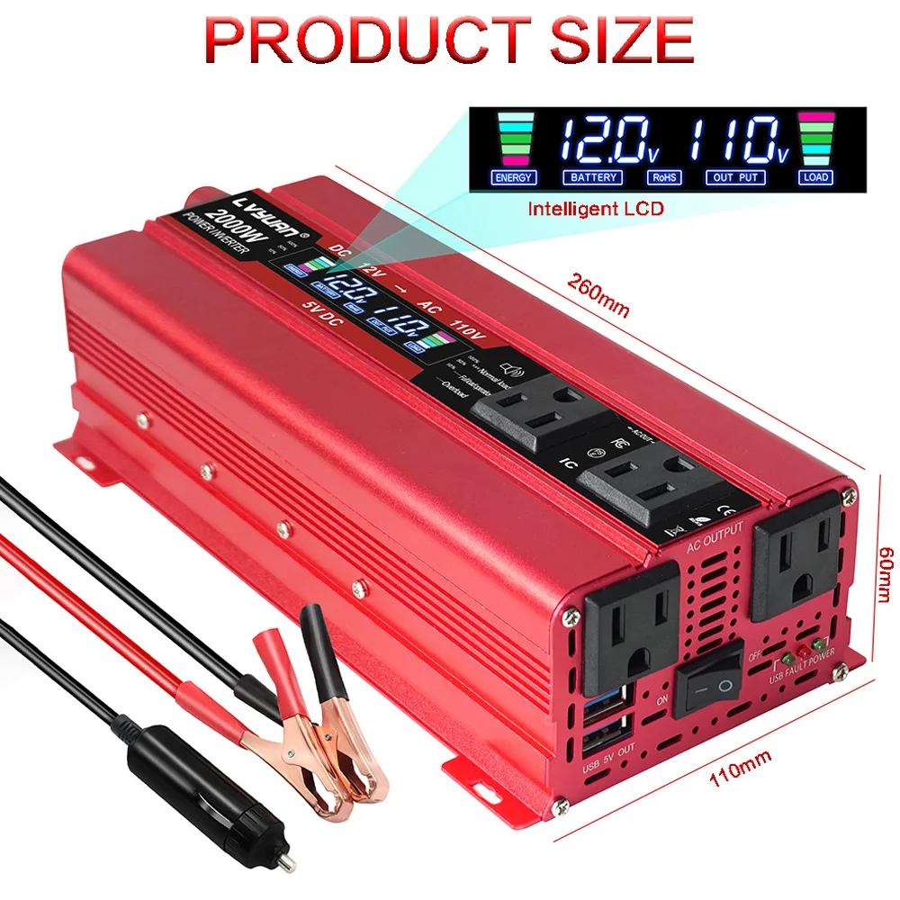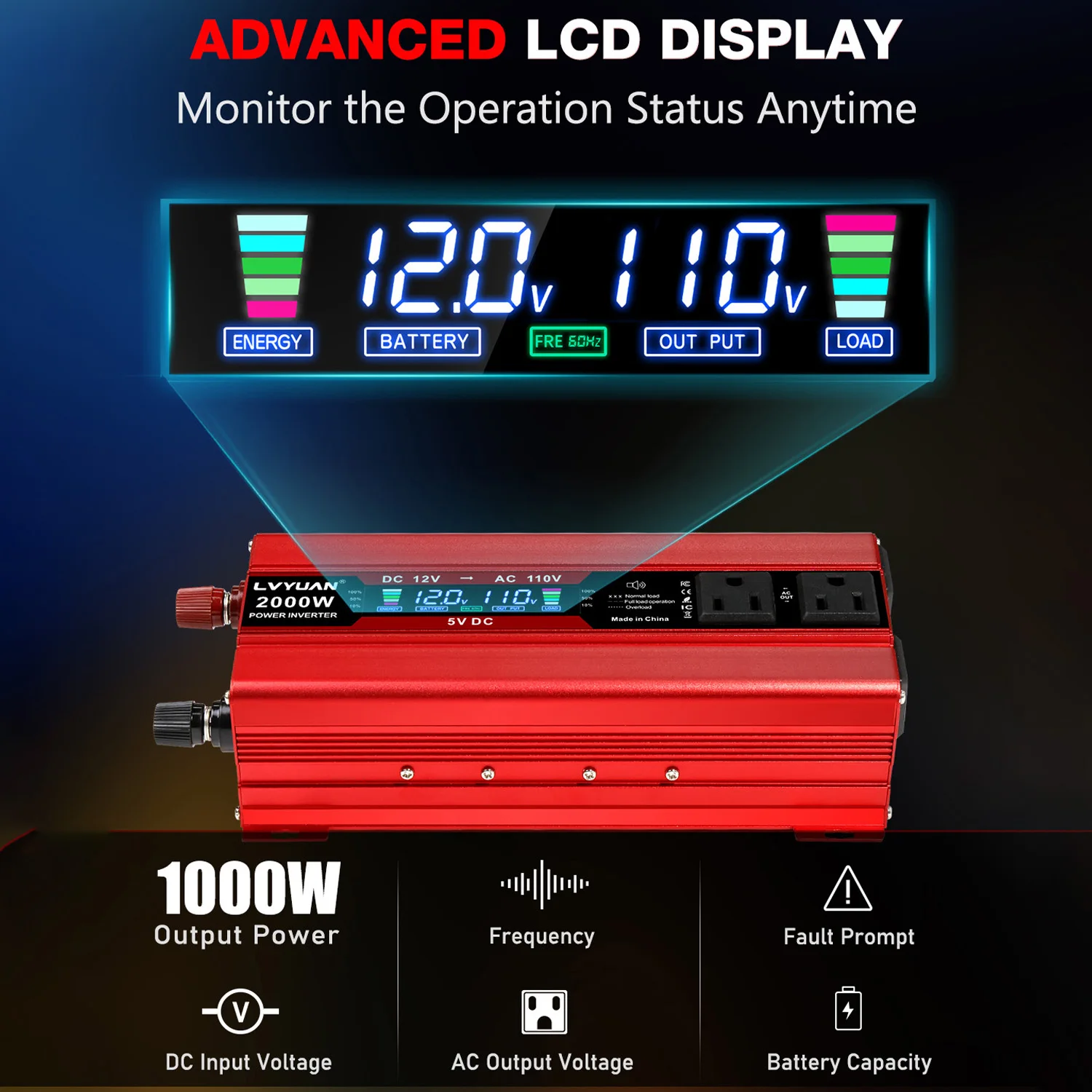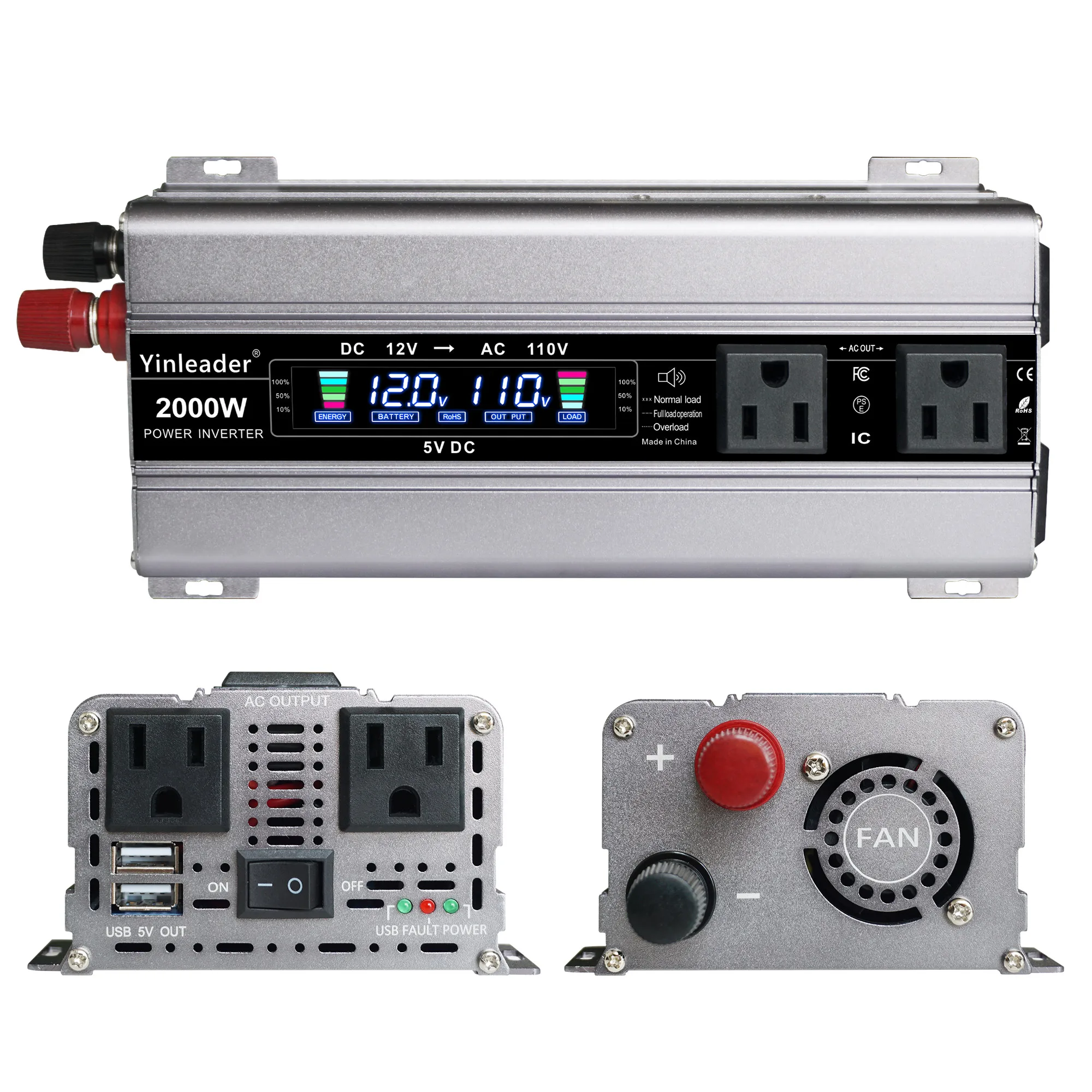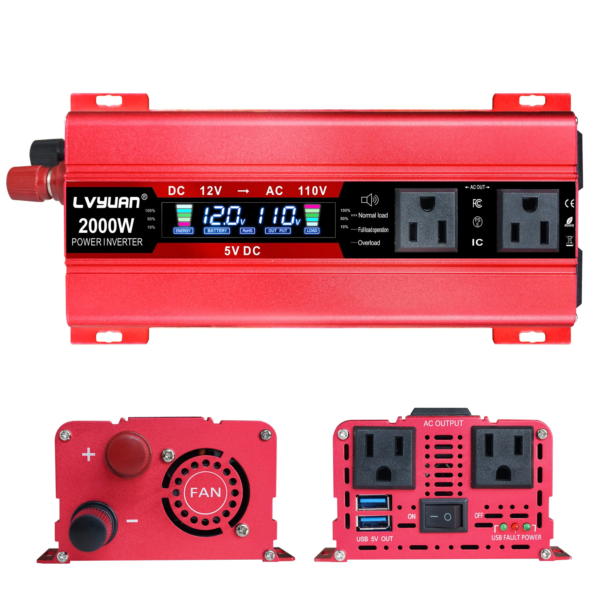 Lvyuan 2000W 12V to 110V รถอินเวอร์เตอร์ดัดแปลง Sine Wave Volatge Converter 60Hz 4 AC US ซ็อกเก็ต Dual USB อินเวอร์เตอร์ LCD