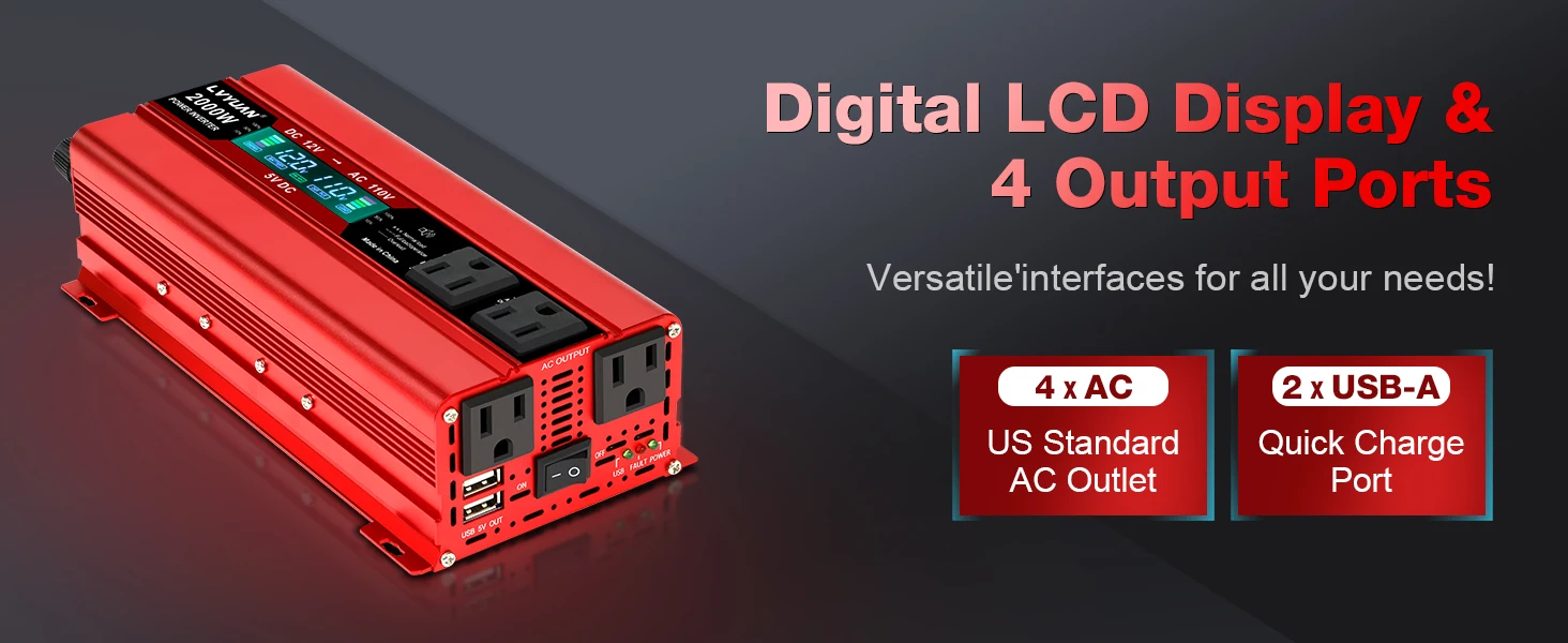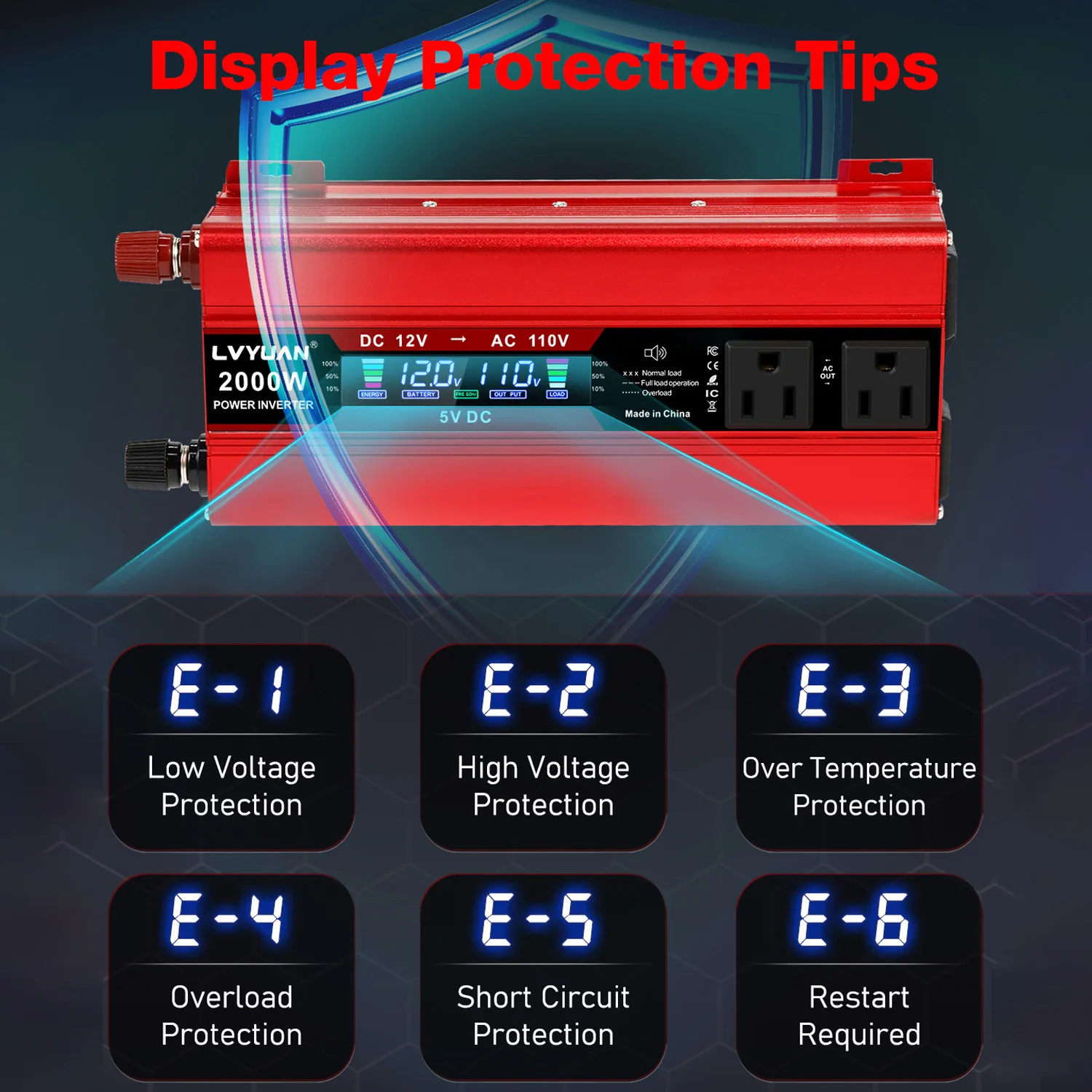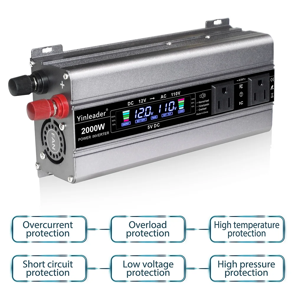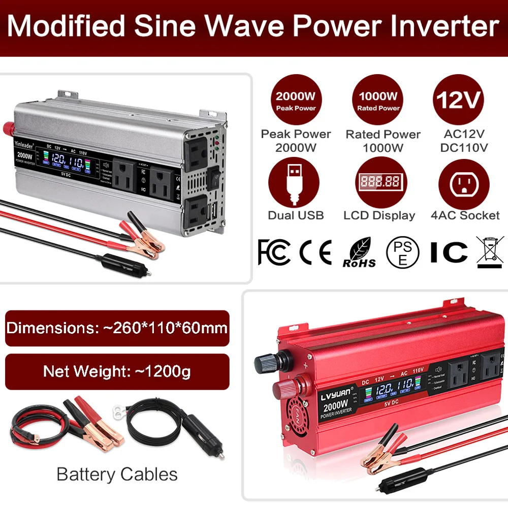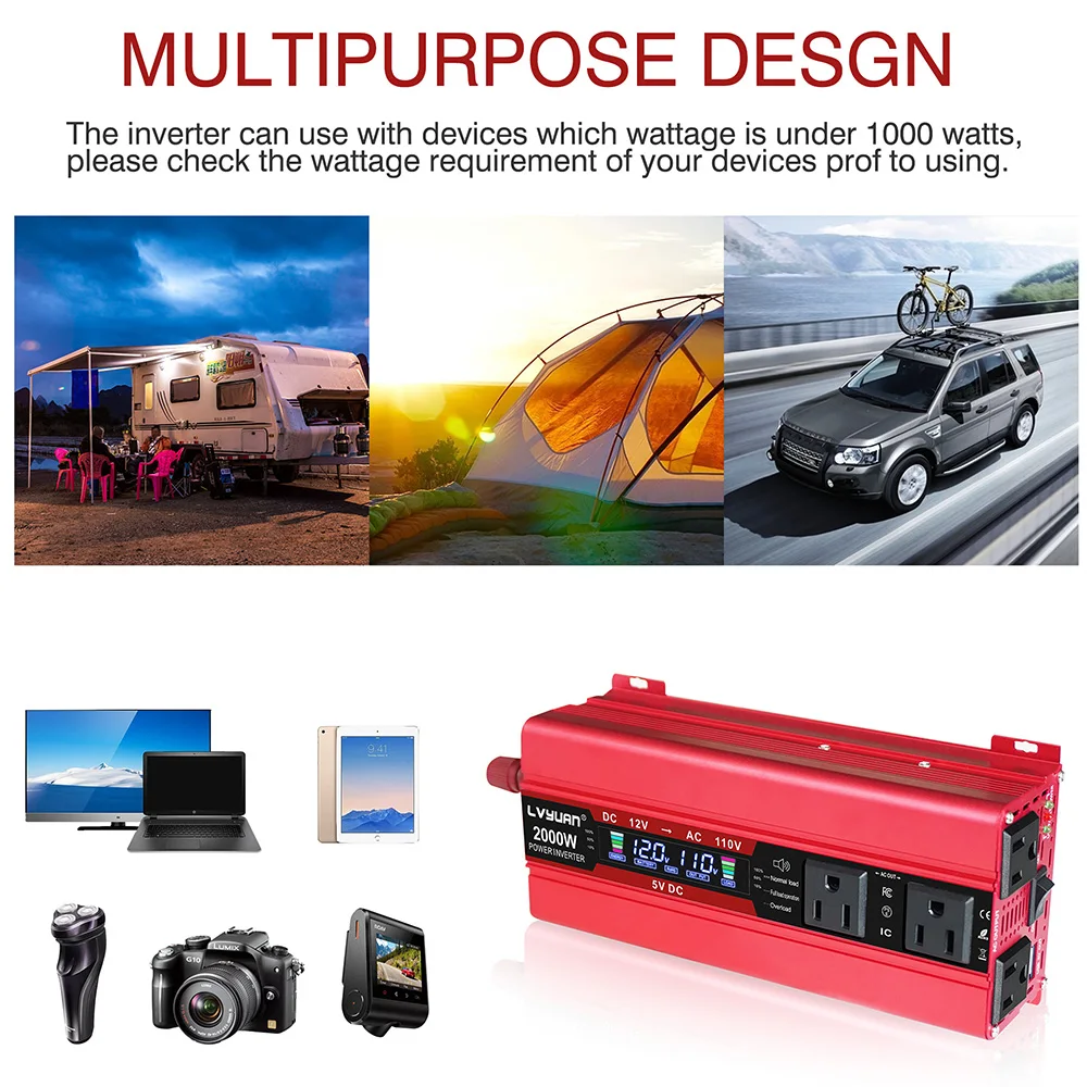 Lvyuan 2000W 12V to 110V รถอินเวอร์เตอร์ดัดแปลง Sine Wave Volatge Converter 60Hz 4 AC US ซ็อกเก็ต Dual USB อินเวอร์เตอร์ LCD