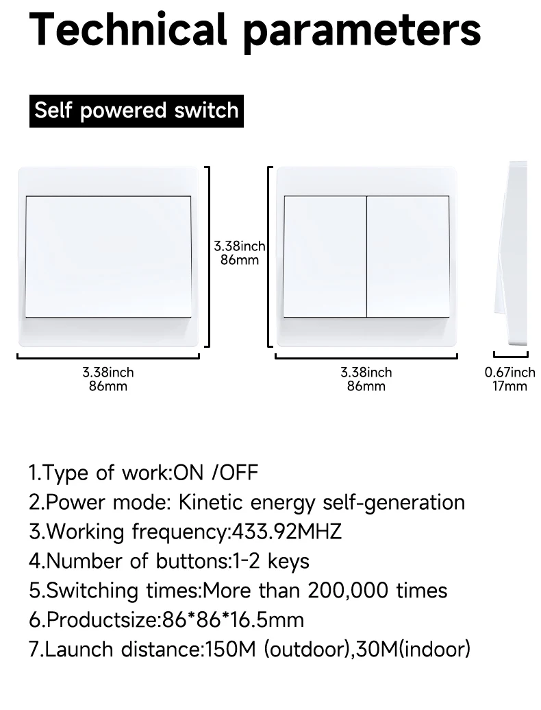 1.แผงชนิด 86 มีกรอบ ไม่มีแบตเตอรี่ตลอดอายุการใช้งาน สร้างกระแสไฟฟ้าเมื่อกด สีเขียว และเป็นมิตรต่อสิ่งแวดล้อม