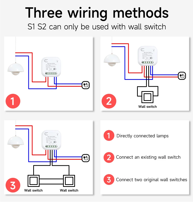 9.S1 และ S2 เป็นอินเทอร์เฟซที่สงวนไว้สําหรับการเชื่อมต่อสวิตช์ผนังไฟเดี่ยวแบบดั้งเดิม ซึ่งสามารถสร้างโหมดควบคุมคู่ด้วยสวิตช์ไร้สายโดยไม่กระทบต่อกันหากไม่จําเป็นก็ไม่จําเป็นต้องเชื่อมต่อ