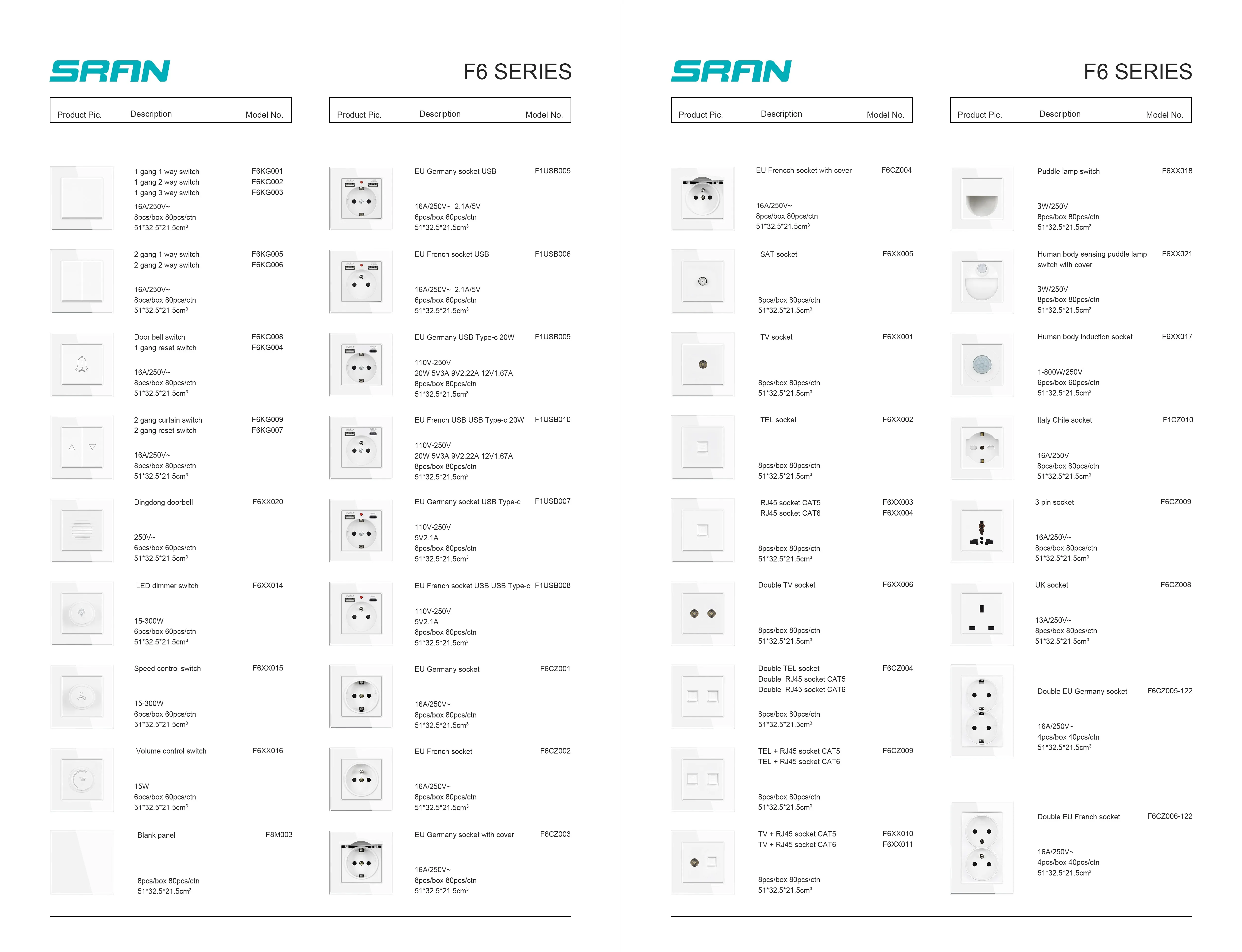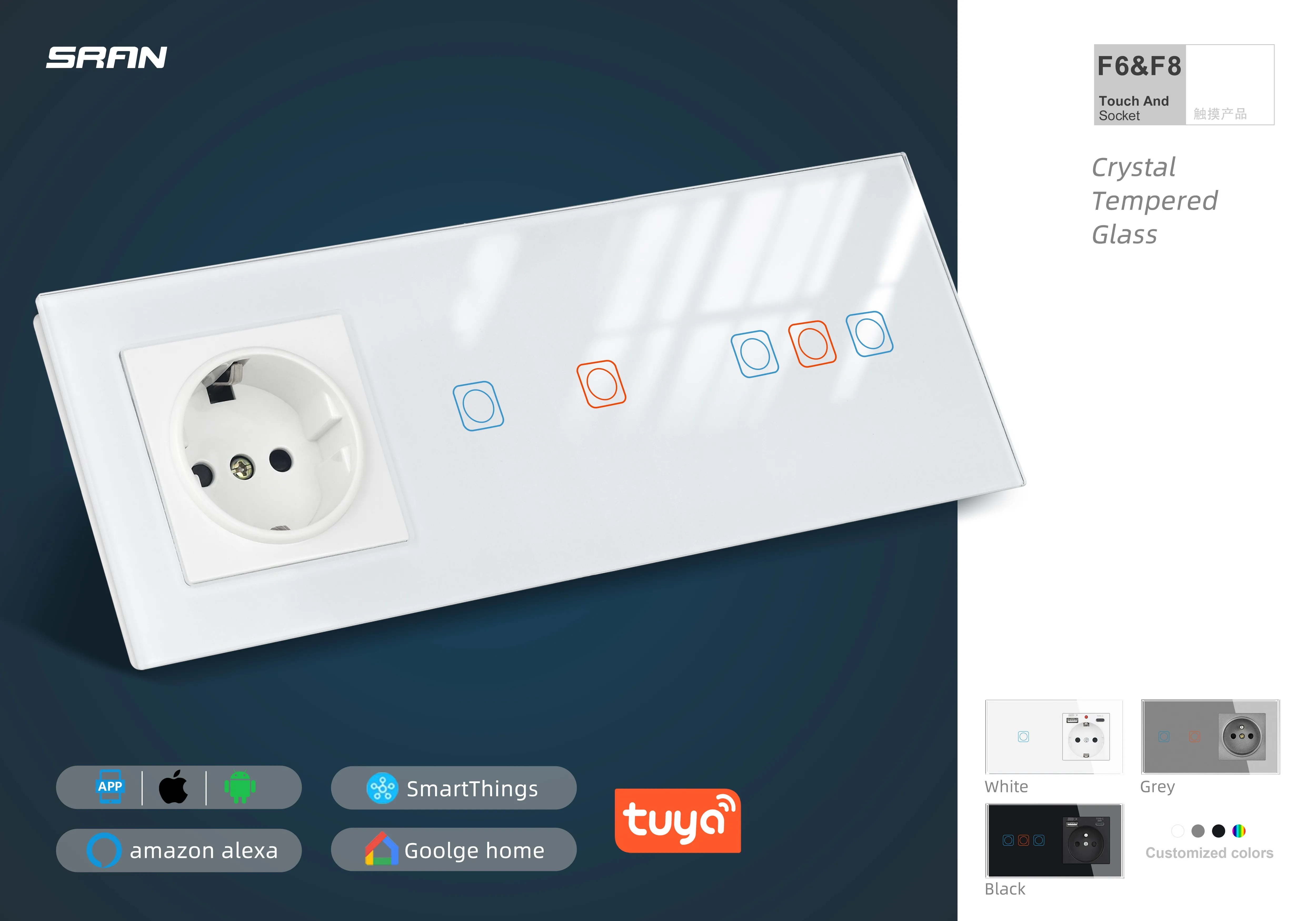 SRAN F6 Series หลายกรอบแผงกระจกนิรภัยสีขาว,EU FR UN ซ็อกเก็ตและสวิทช์ Dimmer พัดลมเท้าโคมไฟ Rj45 โมดูล DIY