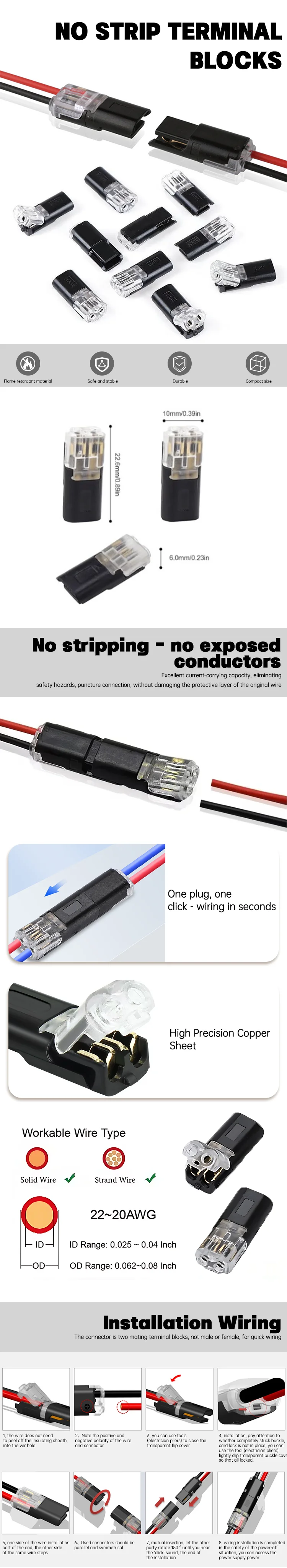 【 ขั้วต่อปลั๊กอินแบบสายคู่ 】ขั้วต่อแบบถอดได้ชนิดปลั๊กอินสองบรรทัดเหมาะสําหรับ 18-22AWG โดยมีพื้นที่หน้าตัด AWG 0.75 ㎡ ~0.35 ㎡ . จะไม่ทําให้ปลายสายไฟเลอะเทอะ ทําให้กล่องไฟค่อนข้างกว้างขวาง และไม่จําเป็นต้องบิดกองสายทองแดงเข้าด้วยกัน