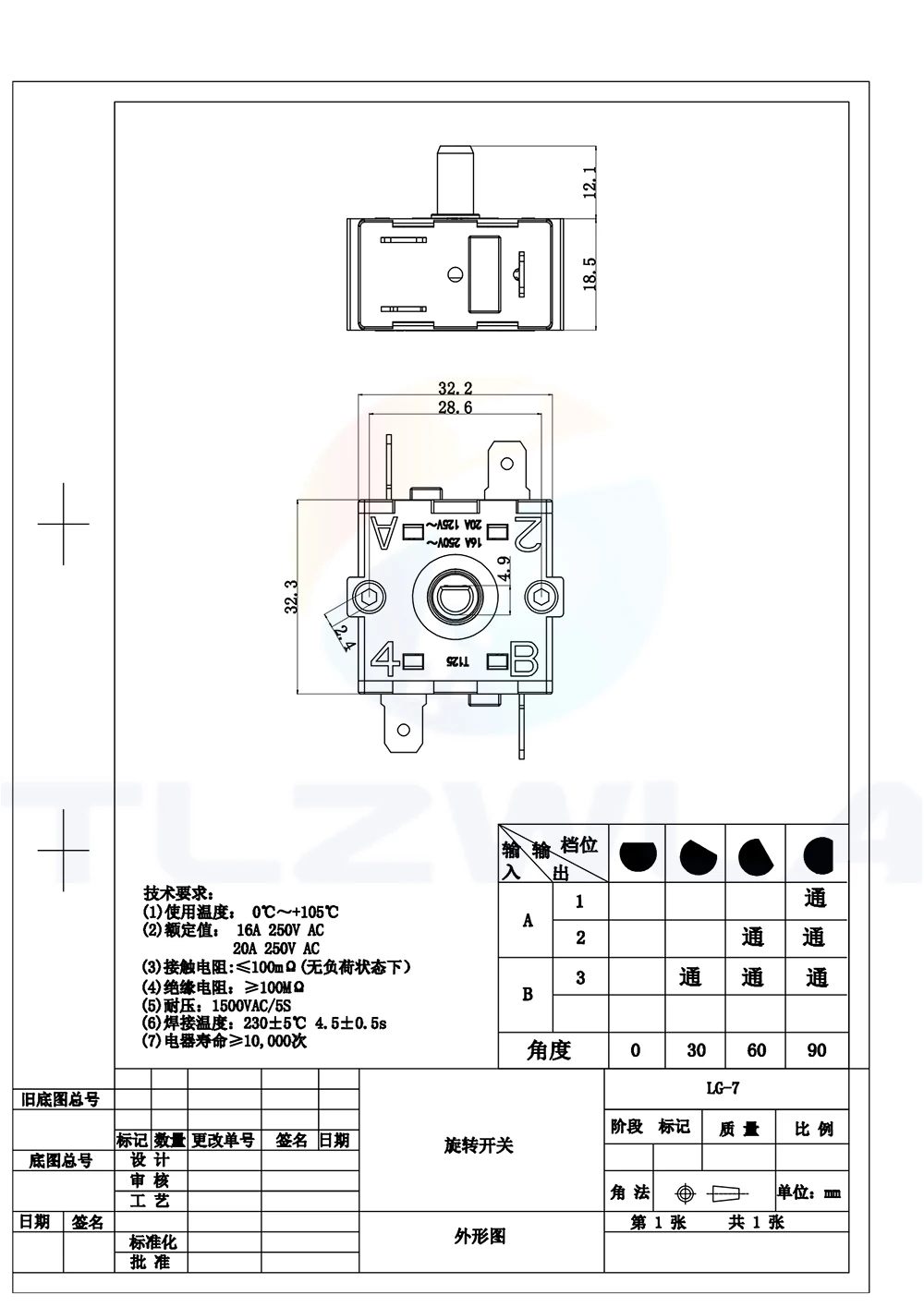 สวิตช์เปลี่ยนตำแหน่งแบบหมุน 1 ชิ้น 2/3/4 ตำแหน่ง 8 ขั้ว 500V 20A รุ่น LW28-20-LW26