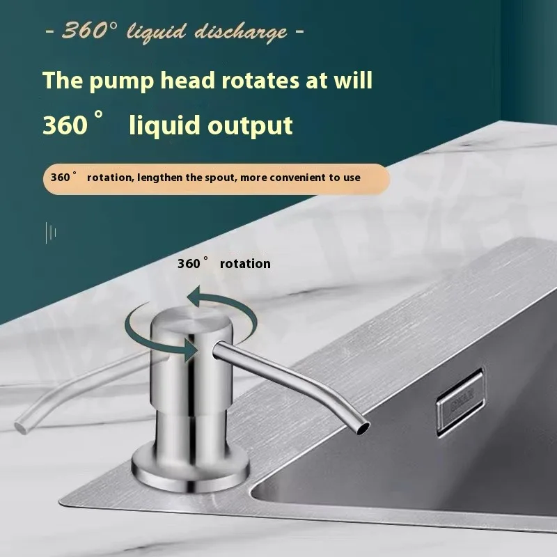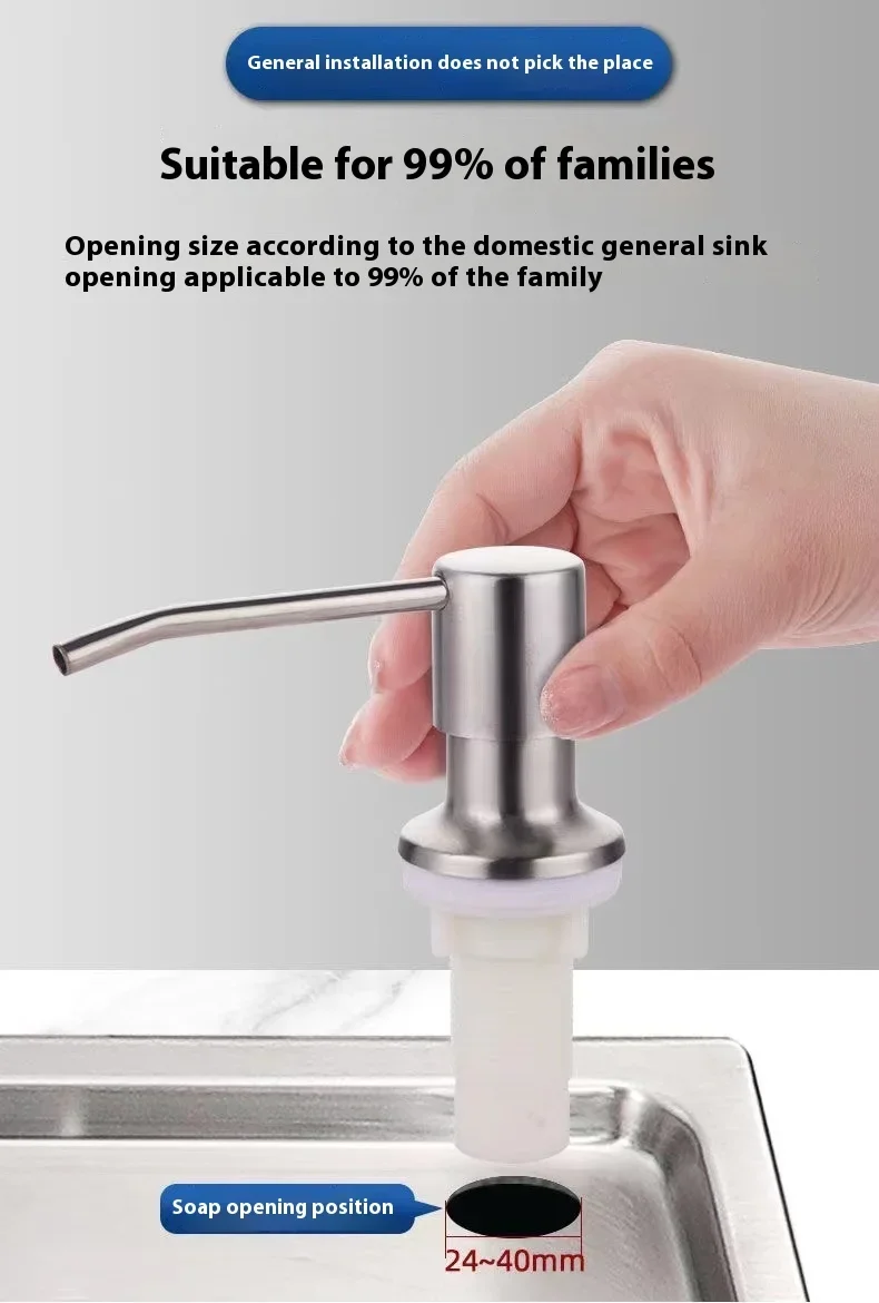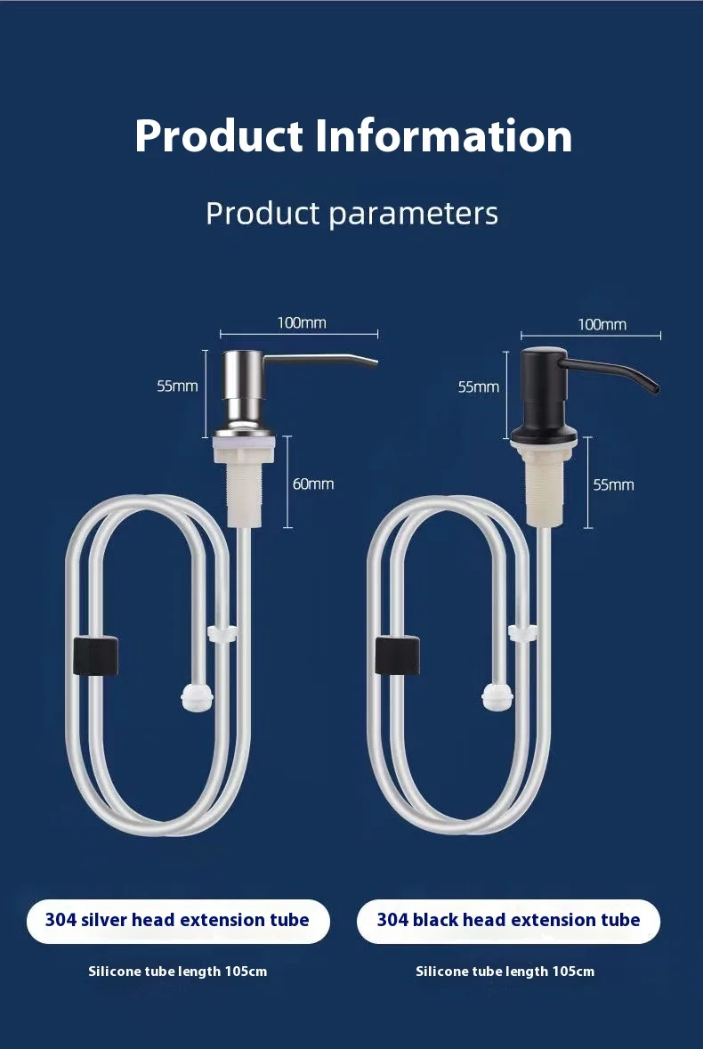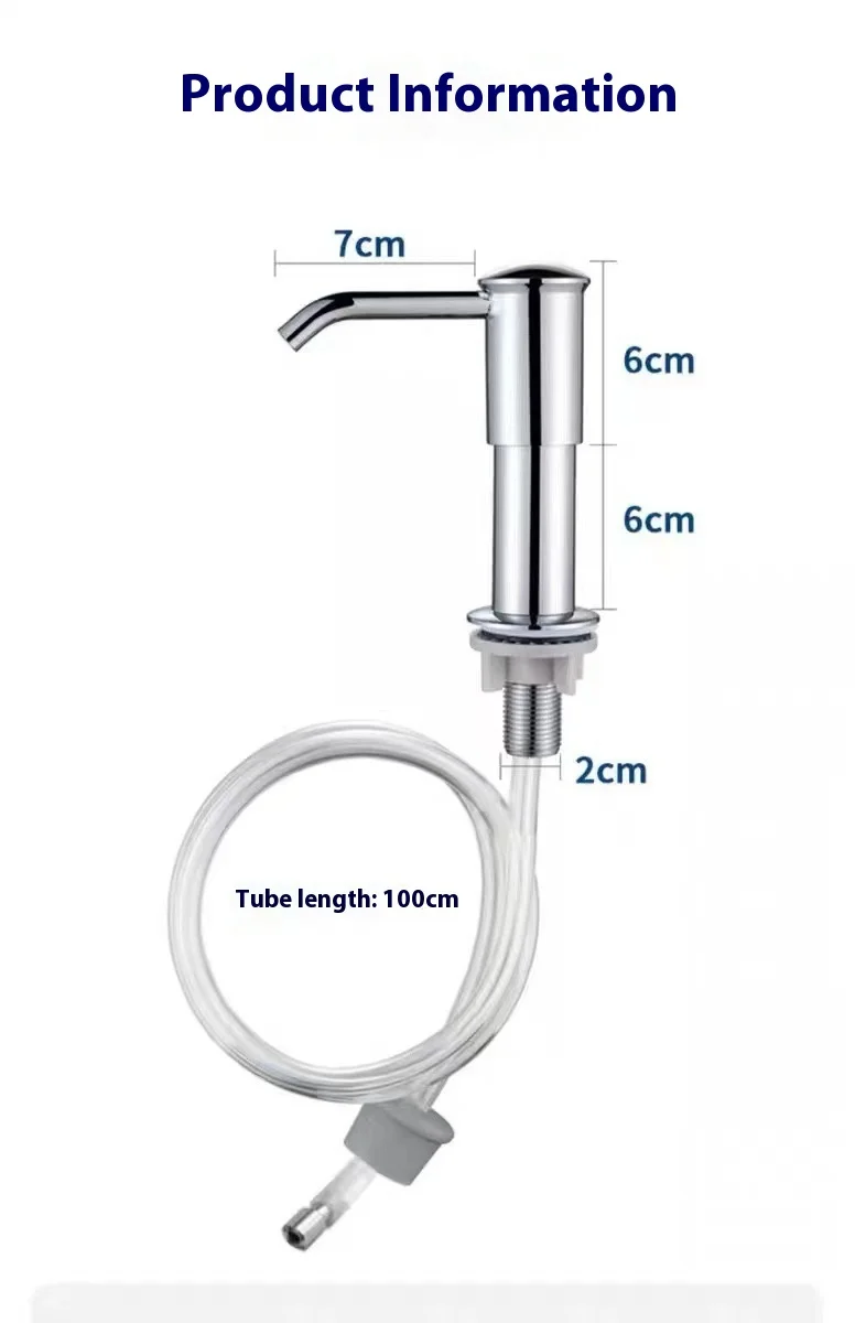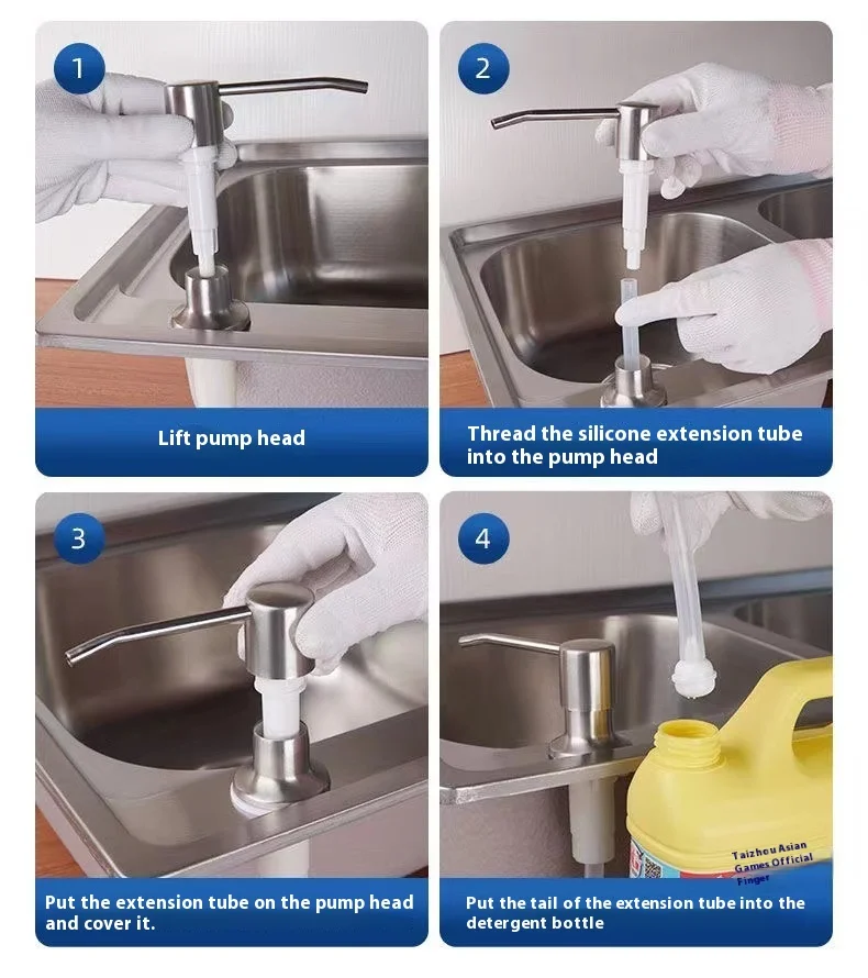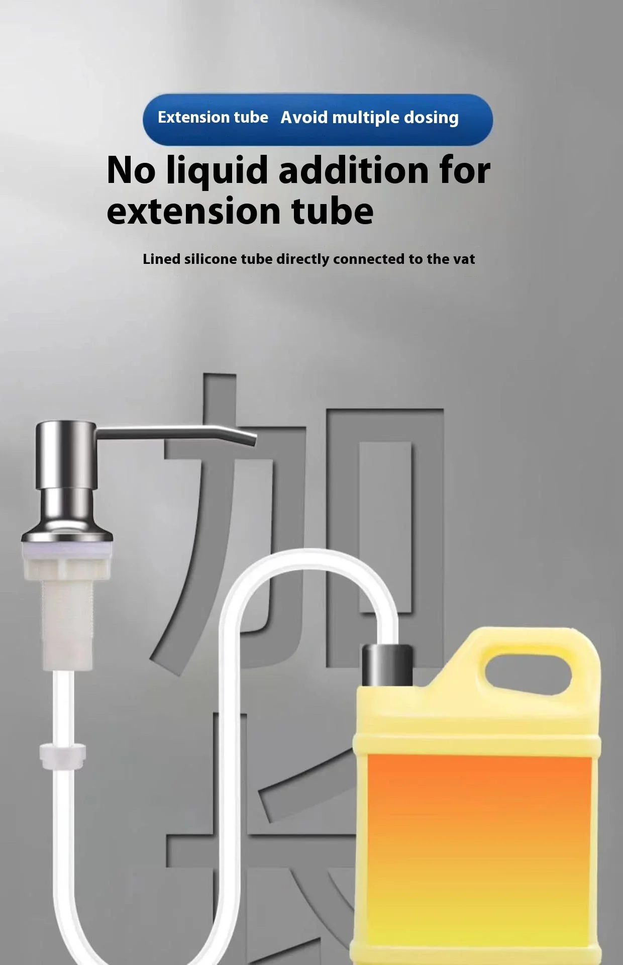 ชื่อสินค้า: เครื่องจ่ายสบู่อ่างล้างจานสแตนเลส 304 พร้อมท่อต่อขยาย – ไม่ต้องเติม ใช้งานได้กับขวดน้ำยาทำความสะอาดทุกประเภท