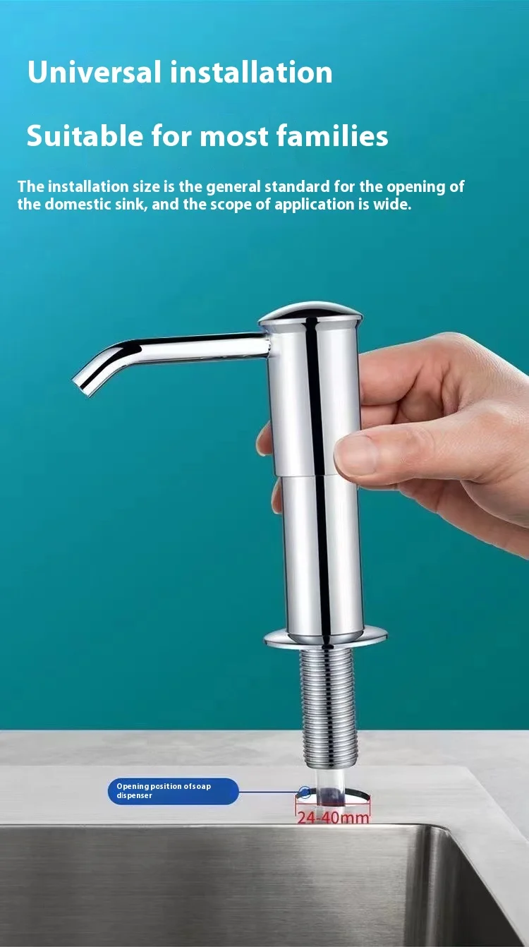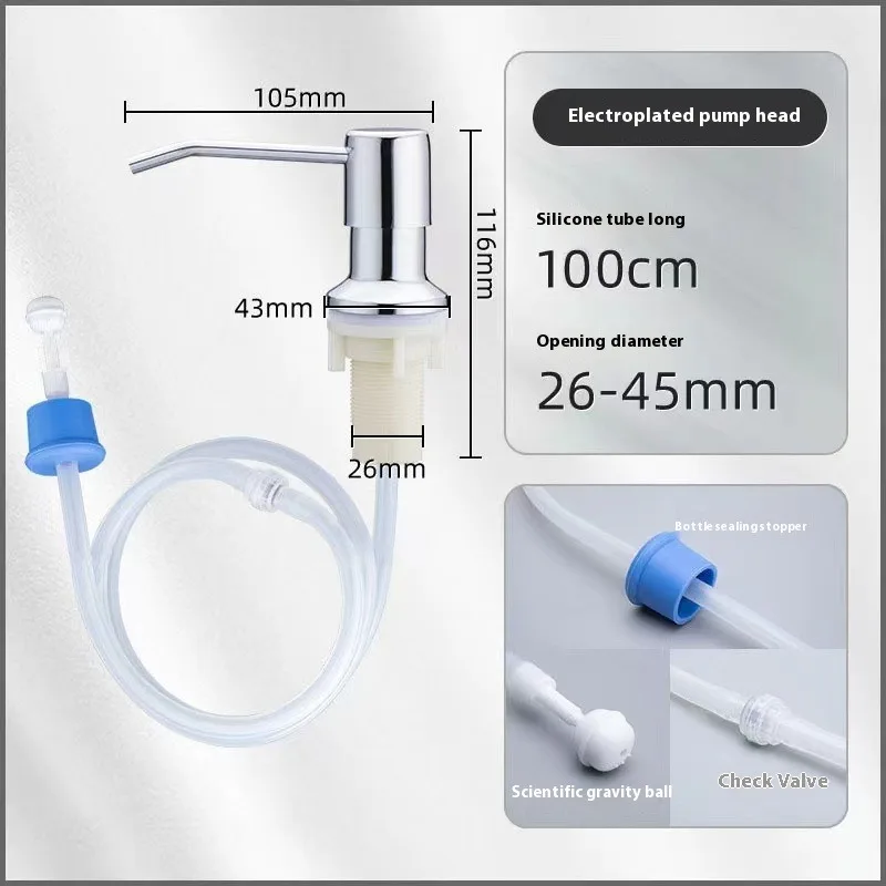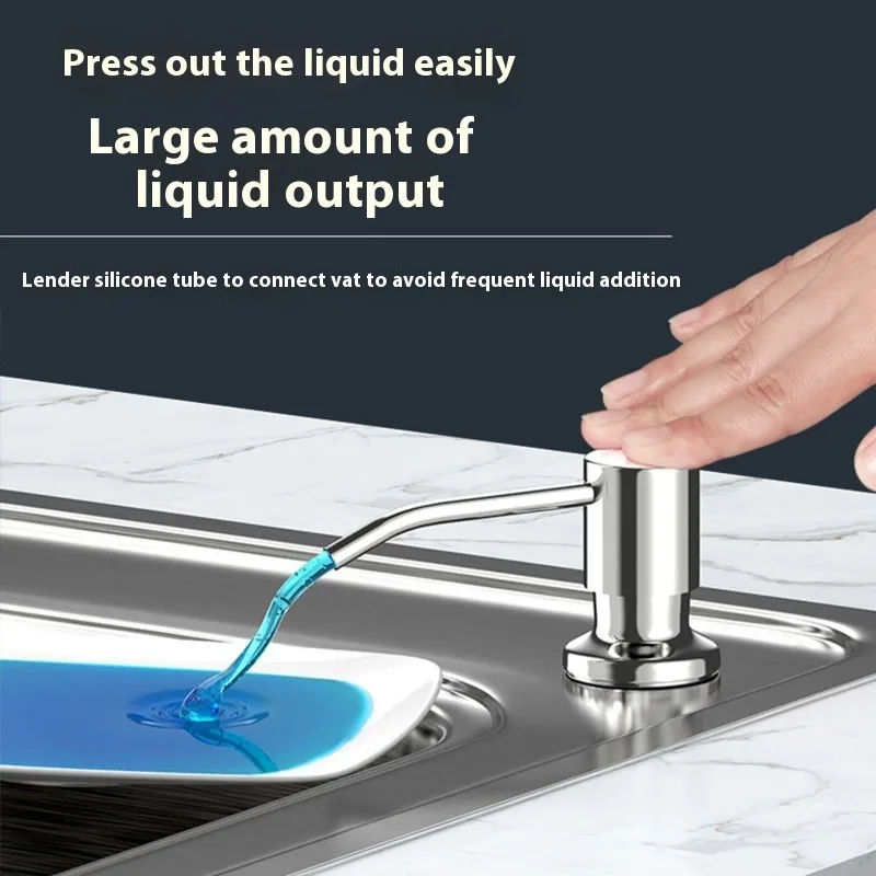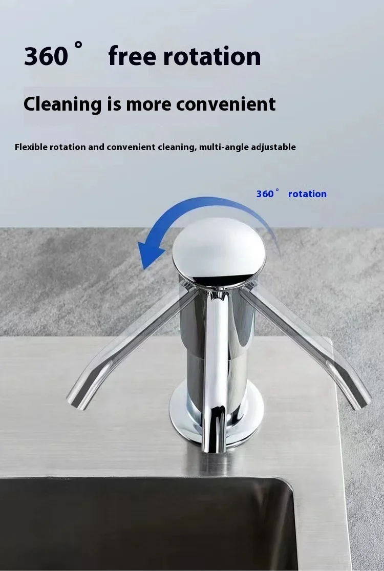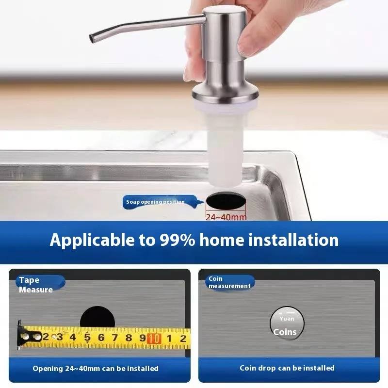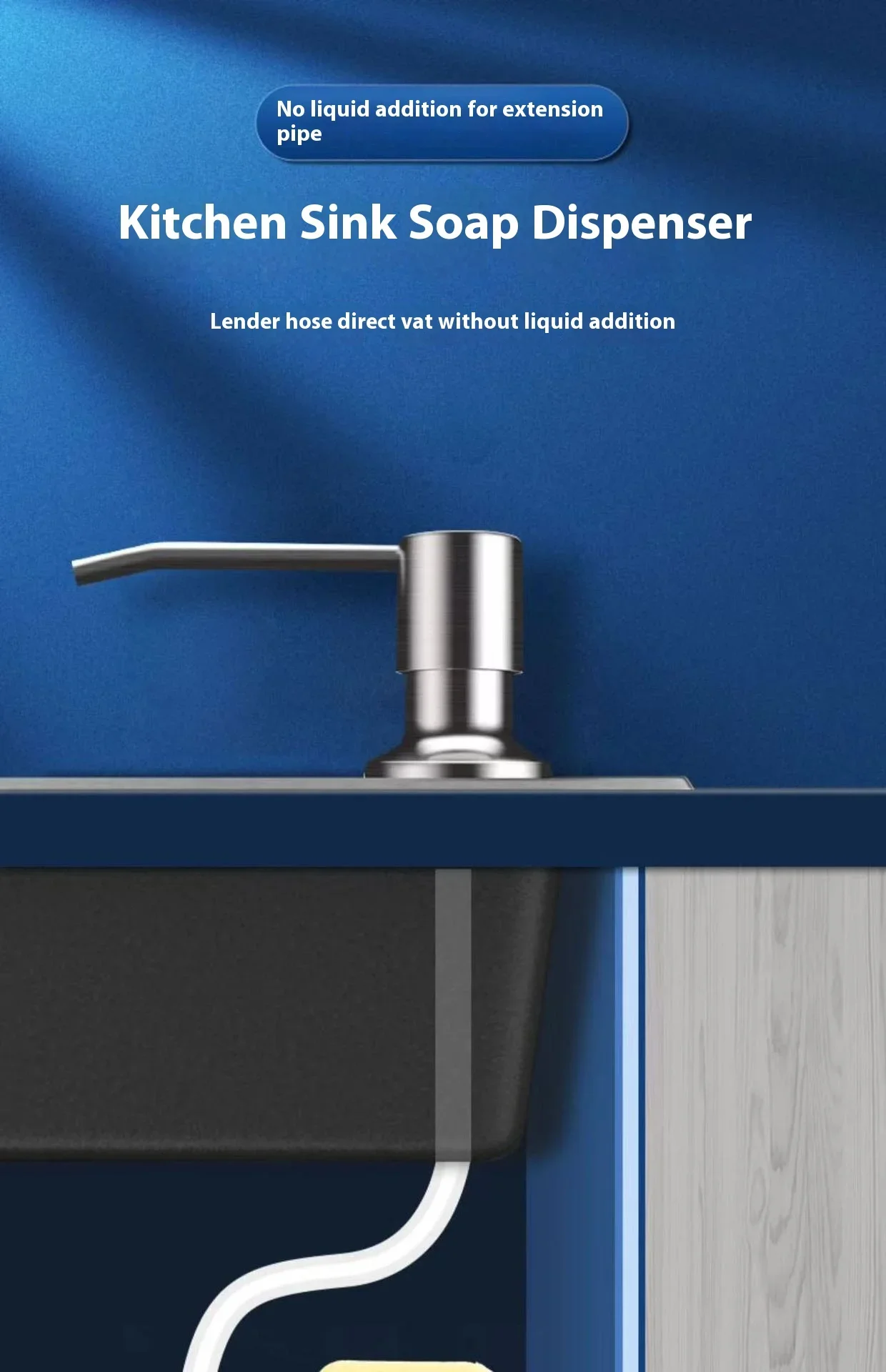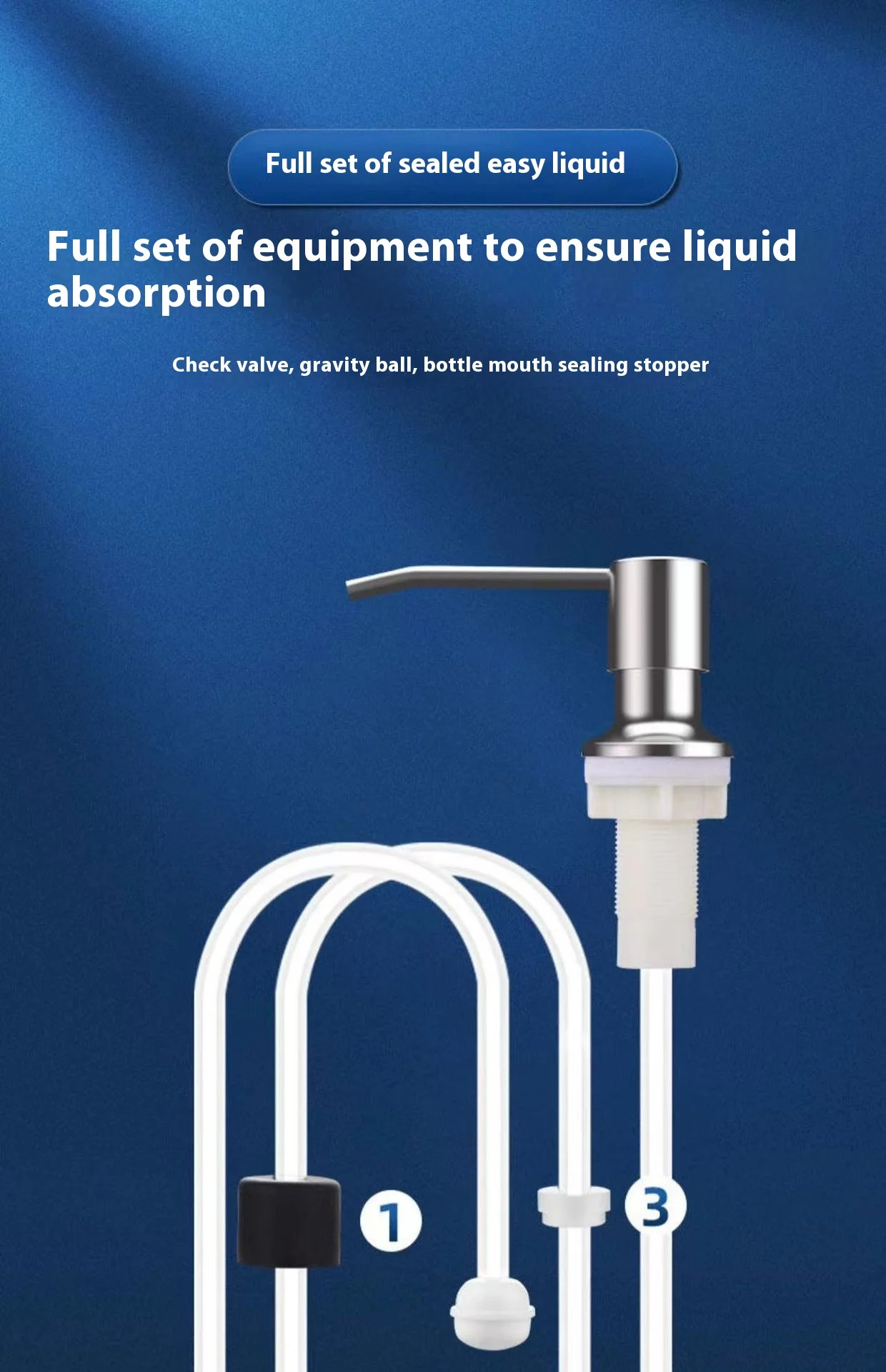 ชื่อสินค้า: เครื่องจ่ายสบู่อ่างล้างจานสแตนเลส 304 พร้อมท่อต่อขยาย – ไม่ต้องเติม ใช้งานได้กับขวดน้ำยาทำความสะอาดทุกประเภท