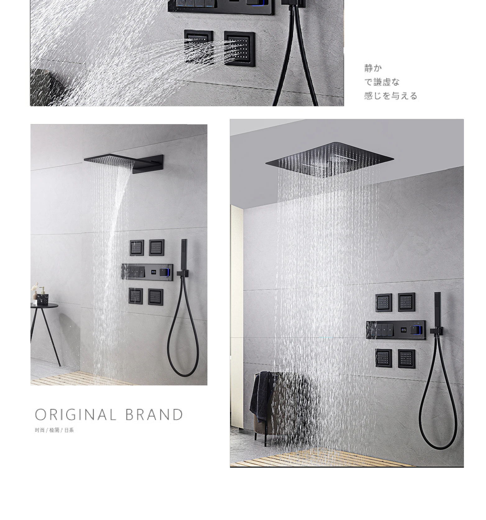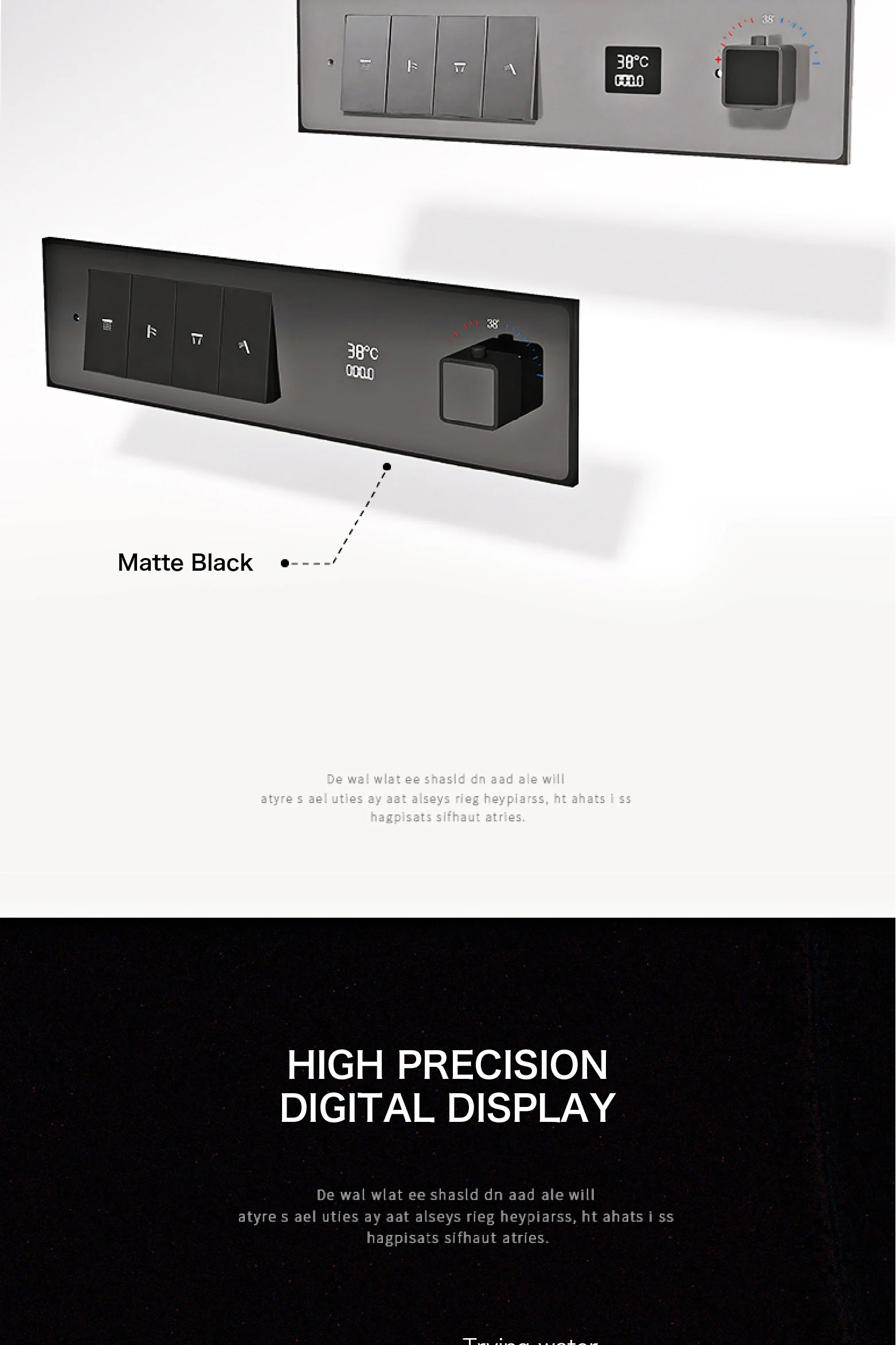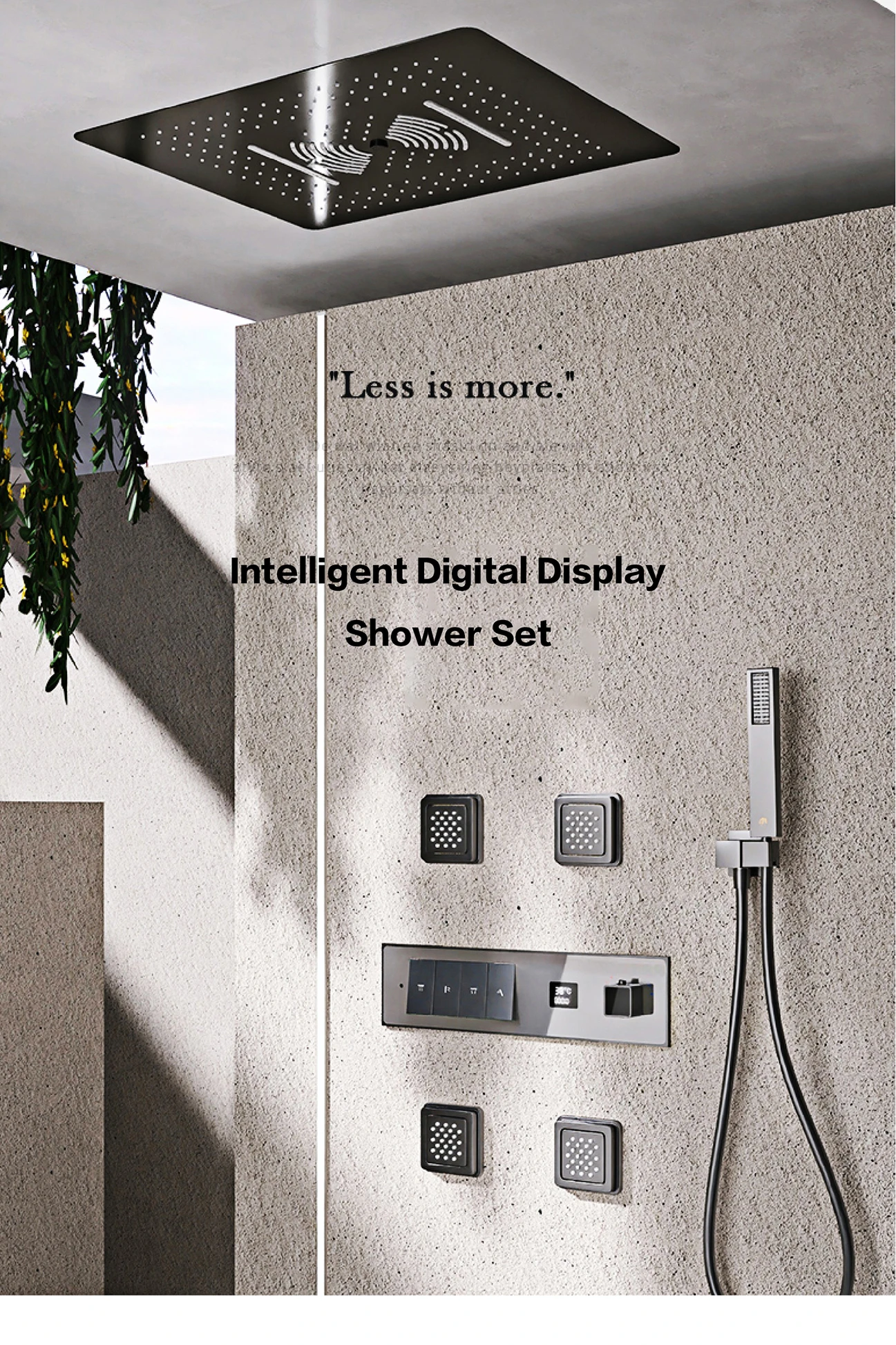 ระบบฝักบัวอาบน้ำทองเหลืองสีดำหรูหรา LED การออกแบบจอแสดงผลดิจิตอลฝักบัวติดผนังแบบร้อนและน้ำเย็นผสมในห้องน้ำ