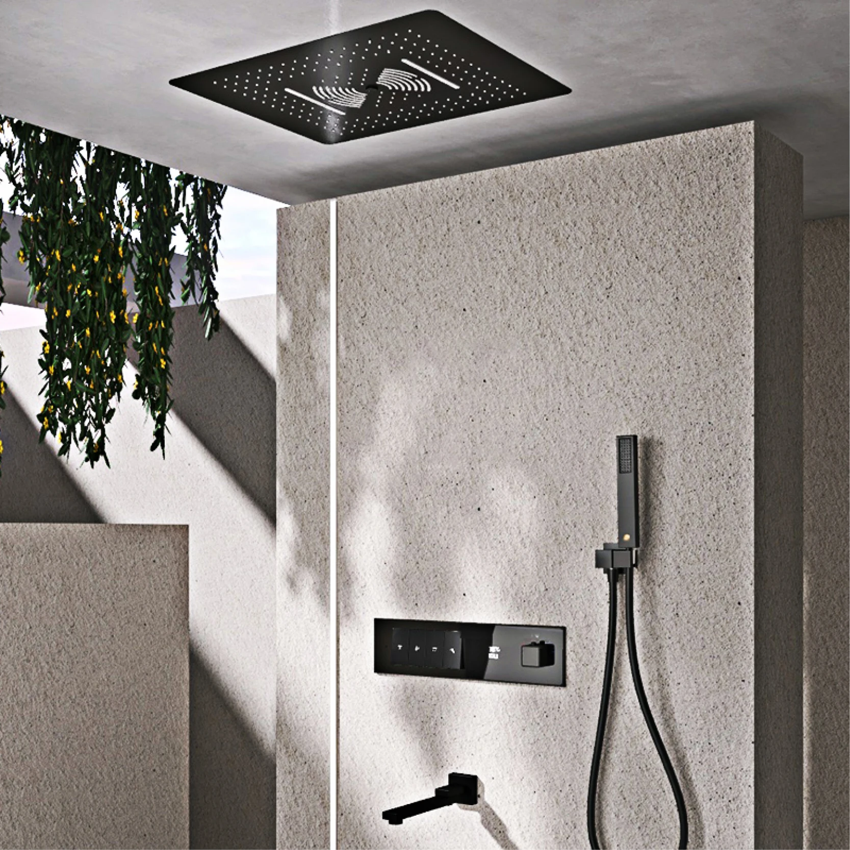 ระบบฝักบัวอาบน้ำทองเหลืองสีดำหรูหรา LED การออกแบบจอแสดงผลดิจิตอลฝักบัวติดผนังแบบร้อนและน้ำเย็นผสมในห้องน้ำ