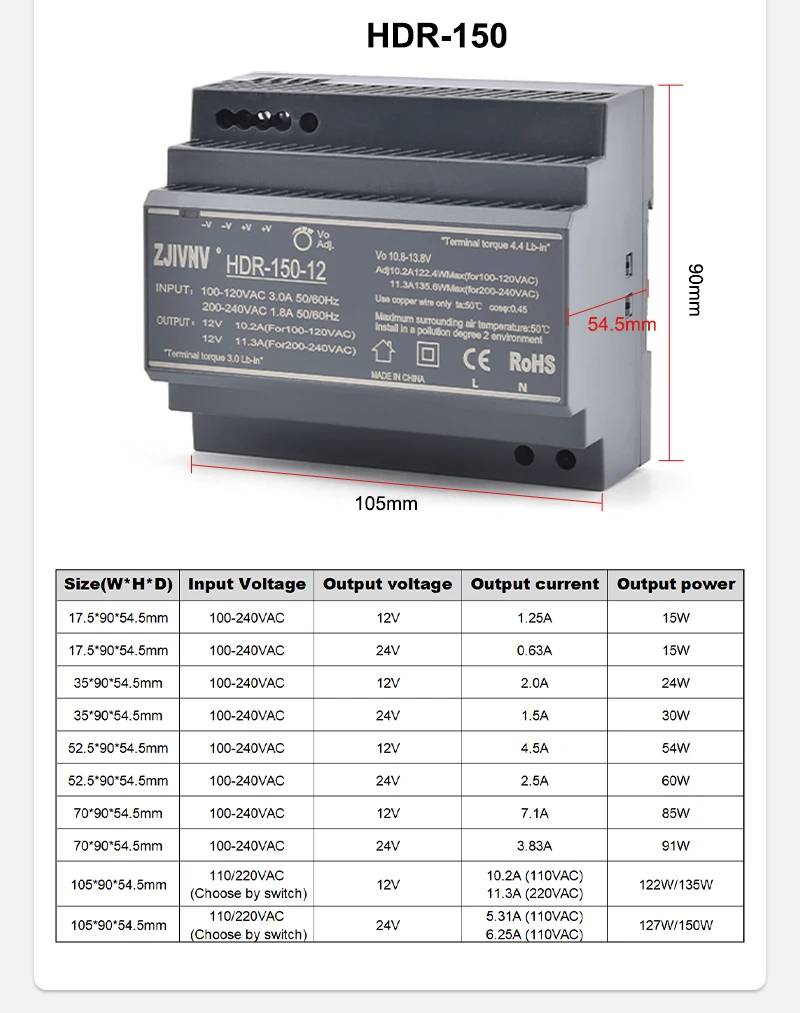 ให้แรงดันเอาต์พุต DC หลายตัว (เช่น 5V, 12V, 24V, 48V เป็นต้น) โดยมีกําลังไฟครอบคลุมตั้งแต่ 15W ถึง 150W เพื่อตอบสนองความต้องการของอุปกรณ์ต่างๆ