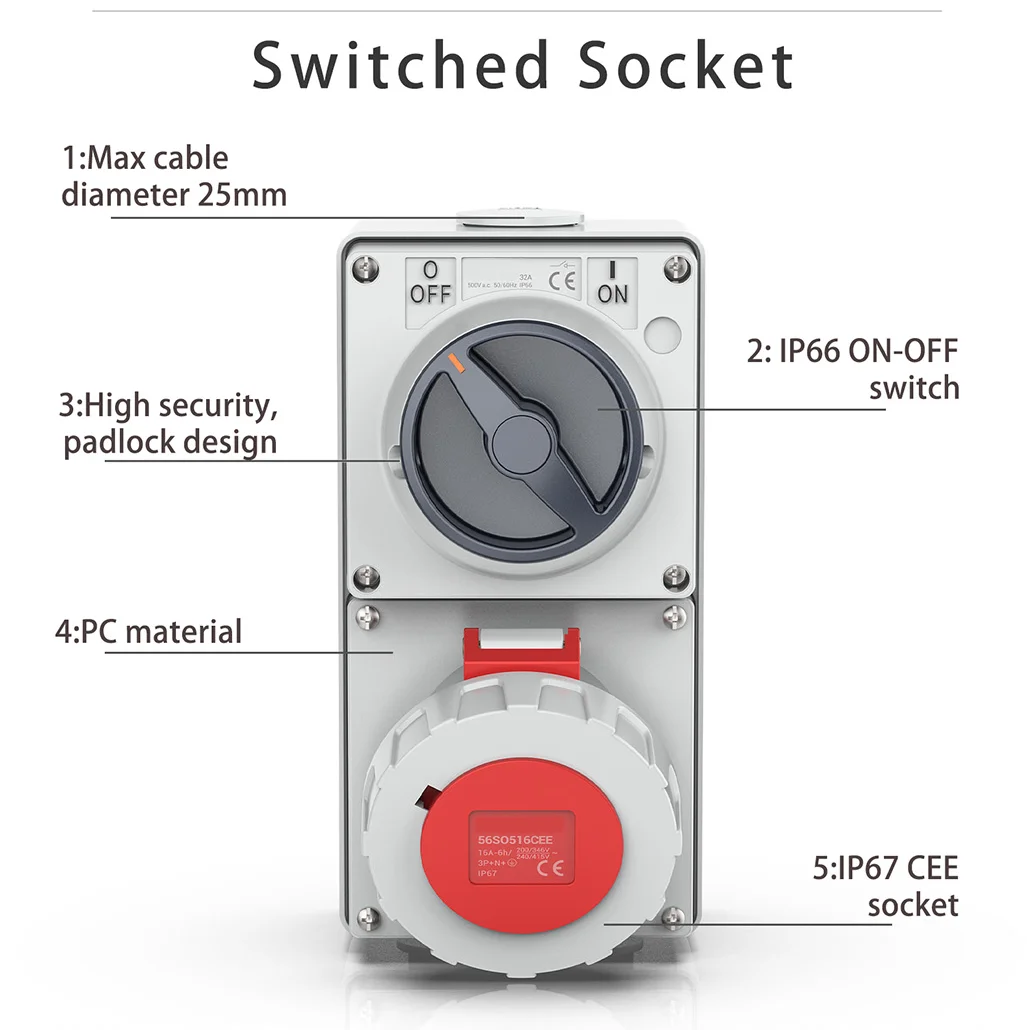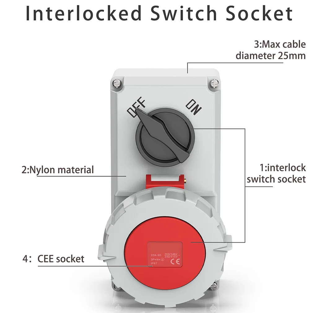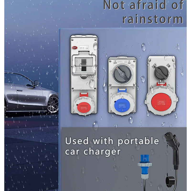 เต้ารับกันน้ำ CEE 3 ขา 32 แอมป์ แบบมีสวิตช์พร้อมระบบป้องกันวงจร สำหรับชาร์จรถยนต์ไฟฟ้า