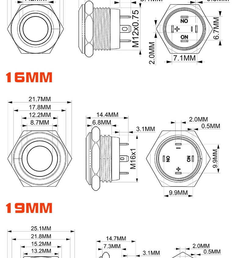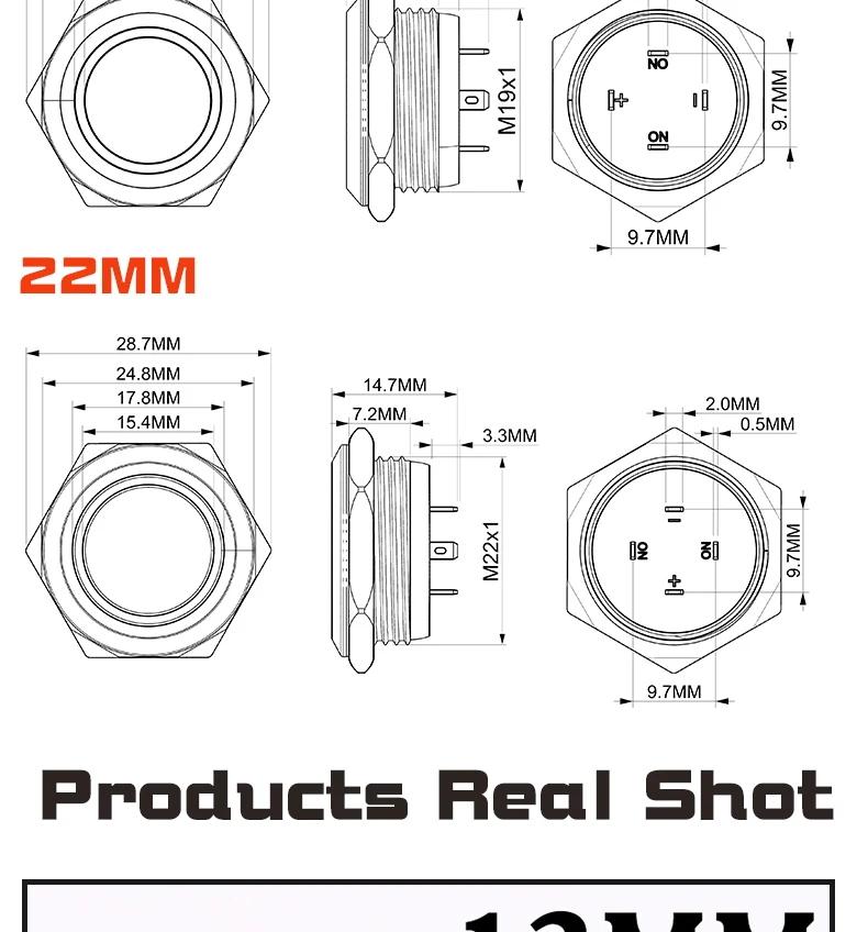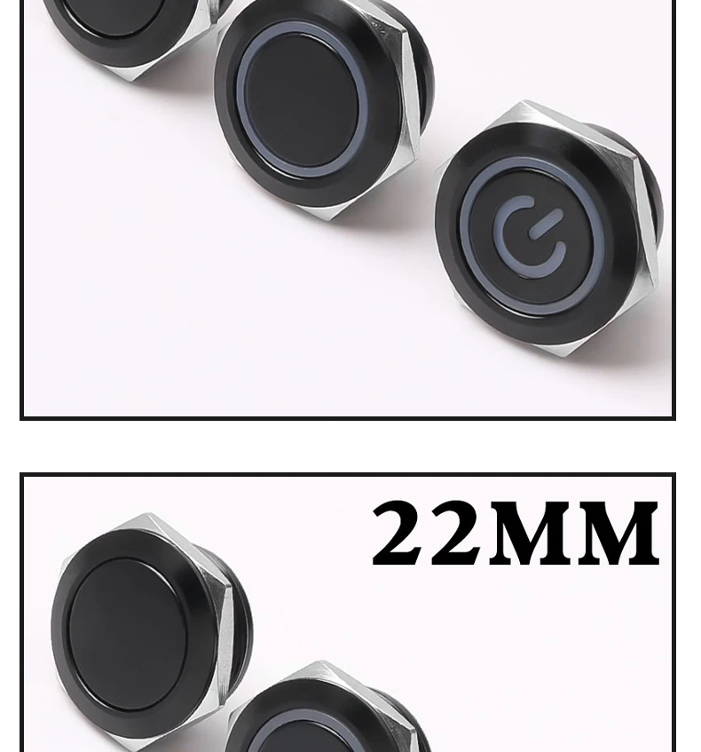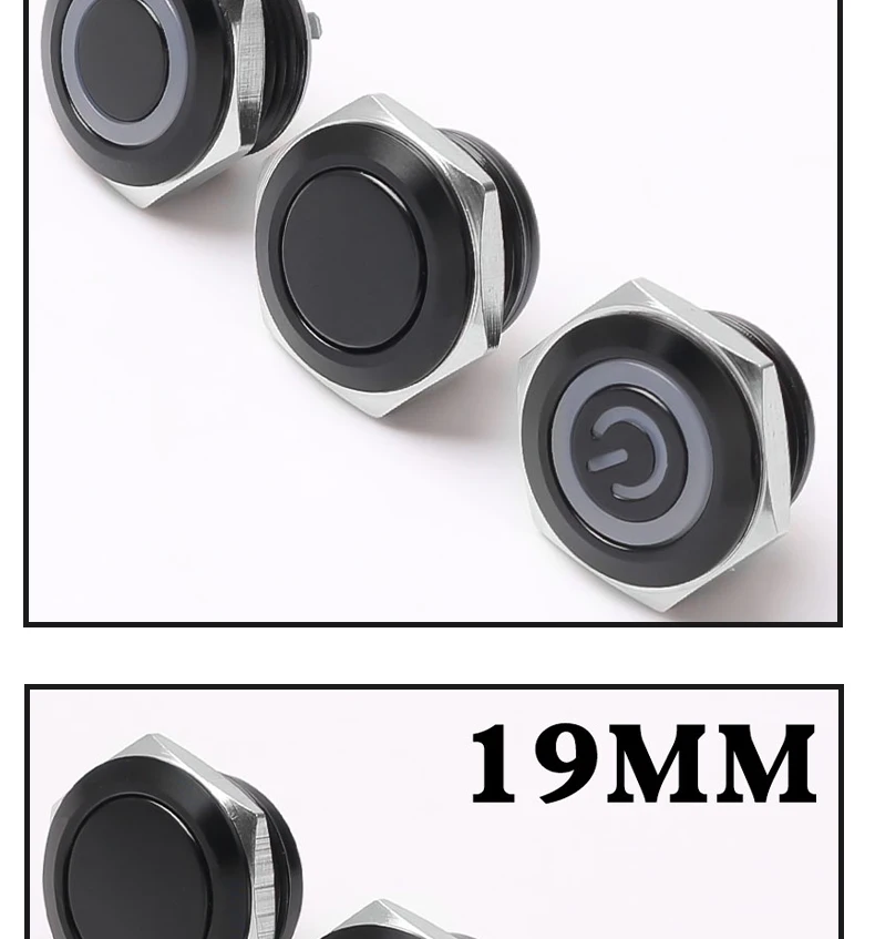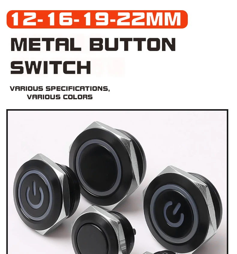 สวิตช์กระดุมโลหะสั้น12/16/19/22มม. หัวแบนกันน้ำพร้อมไฟ LED ชั่วขณะ1NO 6V 24V