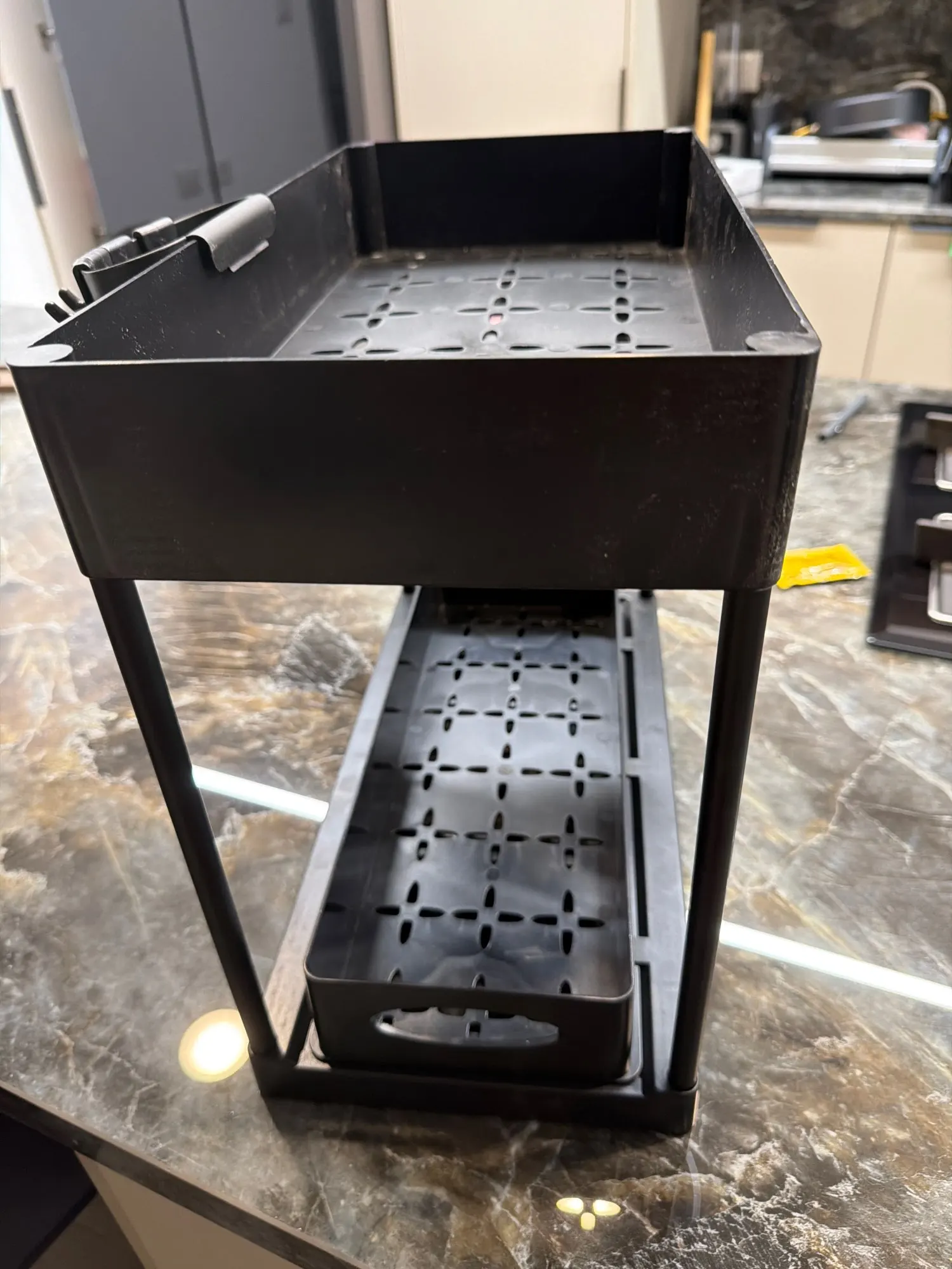 ที่จัดระเบียบใต้อ่างล้างจานได้รับการออกแบบให้มี 2 ชั้น ช่วยเพิ่มการใช้พื้นที่แนวตั้งให้เกิดประโยชน์สูงสุด มาพร้อมตะขอด้านข้าง 4 อันสําหรับแขวนสิ่งของชิ้นเล็กๆ ได้อย่างมีประสิทธิภาพโดยใช้พื้นที่จํากัด