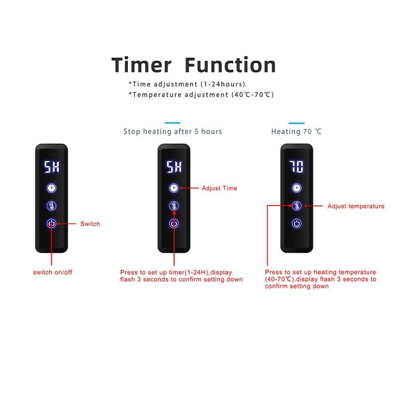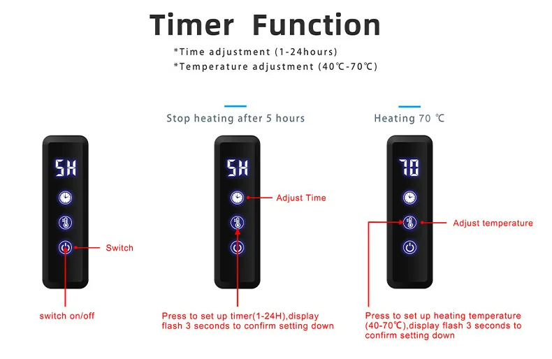 *ปรับอุณหภูมิ (40℃-70℃),กดหนึ่งครั้งเพื่อปรับ 5℃ ,แสดงแฟลช 3 วินาทีเพื่อยืนยันการตั้งค่าหลังจากปิดเครื่องจะเริ่มทํางานจาก 40℃ โดยค่าเริ่มต้น