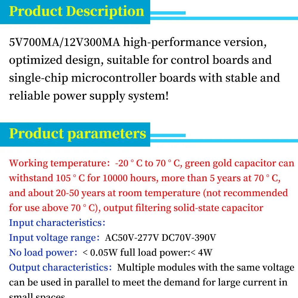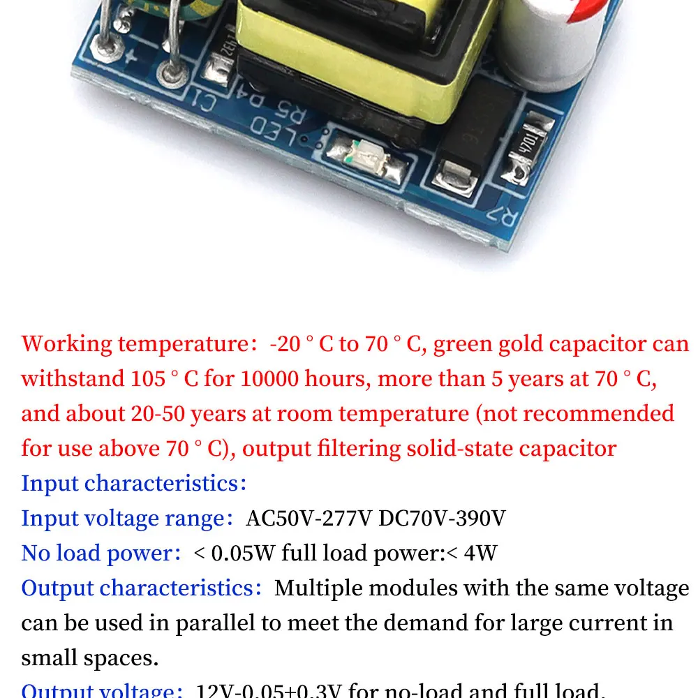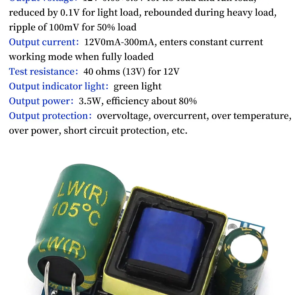 2.กําลังไฟขณะไม่มีโหลด: <0.05W 3.กําลังโหลดเต็ม: <4W 4.อุณหภูมิในการทํางาน: -20 ~ 70 5.ทดสอบความต้านทาน: 40 โอห์ม (12V) สําหรับ 12V 6.กําลังขับ: 3.5W ประสิทธิภาพประมาณ 80% 7.ช่วงแรงดันไฟฟ้าขาเข้า: AC50V-277V DC70V-390V 8.กระแสไฟขาออก: 12VmA-300mA เข้าสู่โหมดกระแสคงที่เมื่อโหลดเต็ม 9.การป้องกันเอาต์พุต: แรงดันไฟฟ้าเกิน, กระแสเกิน, อุณหภูมิเกิน, ป้องกันการลัดวงจร ฯลฯ 10.ลักษณะเอาต์พุต: สามารถใช้โมดูลแรงดันไฟฟ้าหลายโมดูลแบบขนานเพื่อตอบสนองความต้องการของกระแสไฟขนาดเล็กและกระแสไฟฟ้าขนาดใหญ่ 11.แรงดันขาออก: 12V-0.05v+0.3v ไม่มีโหลดและโหลดเต็ม โหลดเบาลบ 0.1V เด้งกลับเมื่อโหลดหนัก ระลอกโหลด 50% 100mV 12.อุณหภูมิความจุ 105° 10,000 ชั่วโมง มากกว่า 5 ปีที่ 70°และประมาณ 20-50 ปี ที่อุณหภูมิห้อง (ไม่แนะนําให้ใช้เกิน 70 ปี)°).