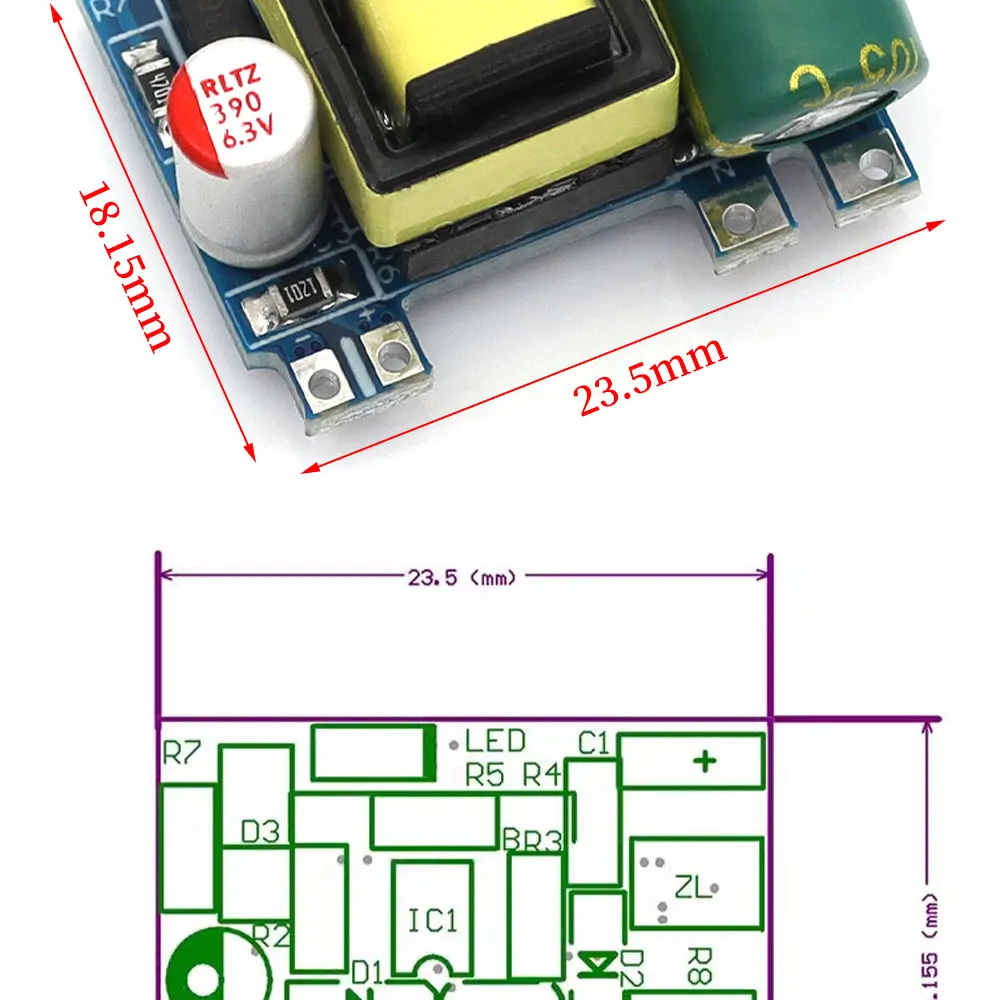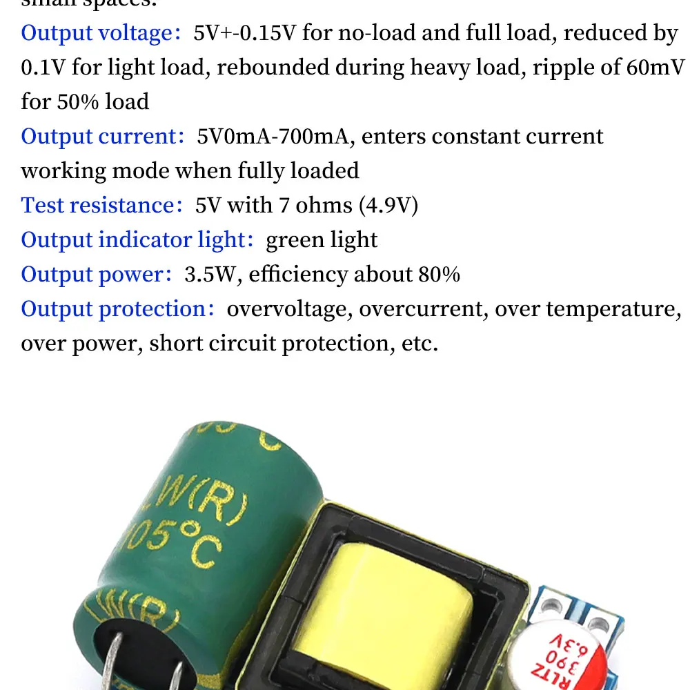 2.กําลังโหลดเต็ม: <4W 3.กําลังไฟขณะไม่มีโหลด: <0.05W 4.อุณหภูมิในการทํางาน: -20 ~ 70 5.ทดสอบความต้านทาน: 7 โอห์ม (4.9V) สําหรับ 5V 6.กําลังขับ: 3.5W ประสิทธิภาพประมาณ 80% 7.ช่วงแรงดันไฟฟ้าขาเข้า: AC50V-277V DC70V-390V 8.กระแสไฟขาออก: 5VmA-700mA เข้าสู่โหมดกระแสคงที่เมื่อโหลดเต็ม 9.การป้องกันเอาต์พุต: แรงดันไฟฟ้าเกิน, กระแสเกิน, อุณหภูมิเกิน, ป้องกันการลัดวงจร ฯลฯ 10.ลักษณะเอาต์พุต: สามารถใช้โมดูลแรงดันไฟฟ้าหลายโมดูลแบบขนานเพื่อตอบสนองความต้องการของกระแสไฟขนาดเล็กและกระแสไฟฟ้าขนาดใหญ่ 11.แรงดันขาออก: 5V + 0.15v ไม่มีโหลดและโหลดเต็ม, โหลดเบาลบ 0.1V, ฟื้นตัวเมื่อโหลดหนัก, ระลอกโหลด 50% 60mV 12.อุณหภูมิความจุ 105° 10,000 ชั่วโมง มากกว่า 5 ปีที่ 70°และประมาณ 20-50 ปี ที่อุณหภูมิห้อง (ไม่แนะนําให้ใช้เกิน 70 ปี)°). ขนาดสินค้า