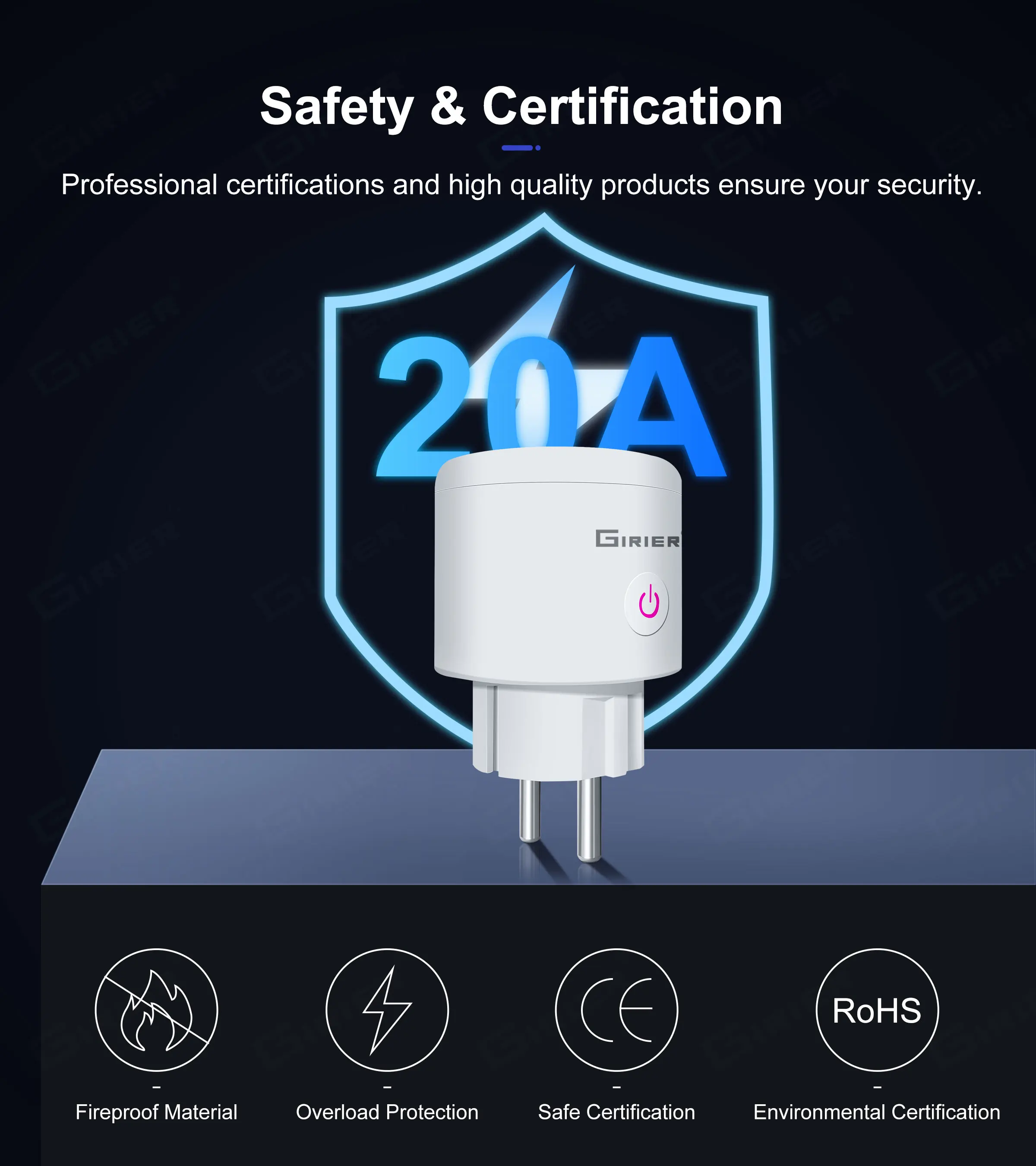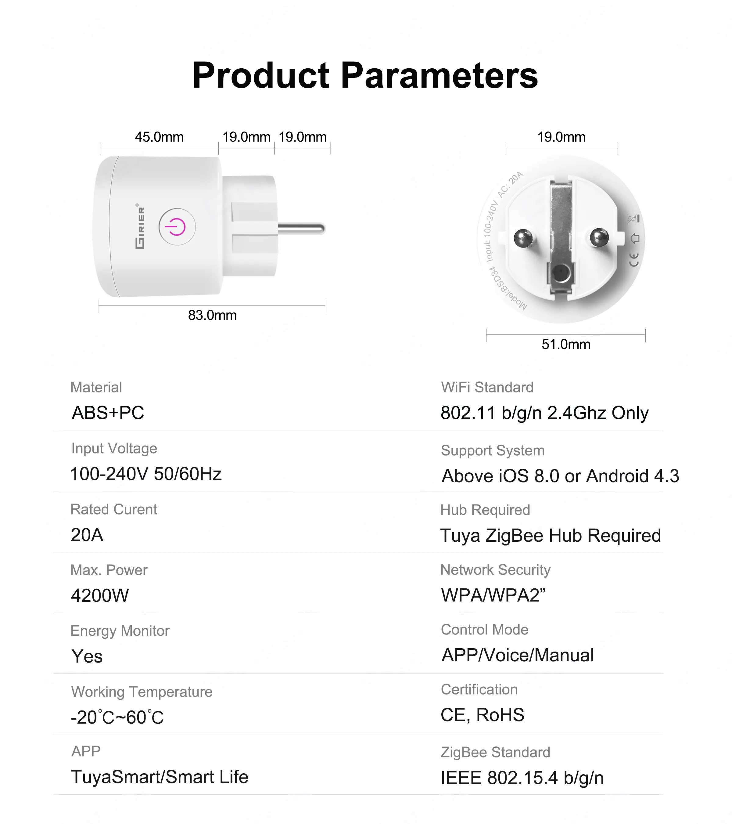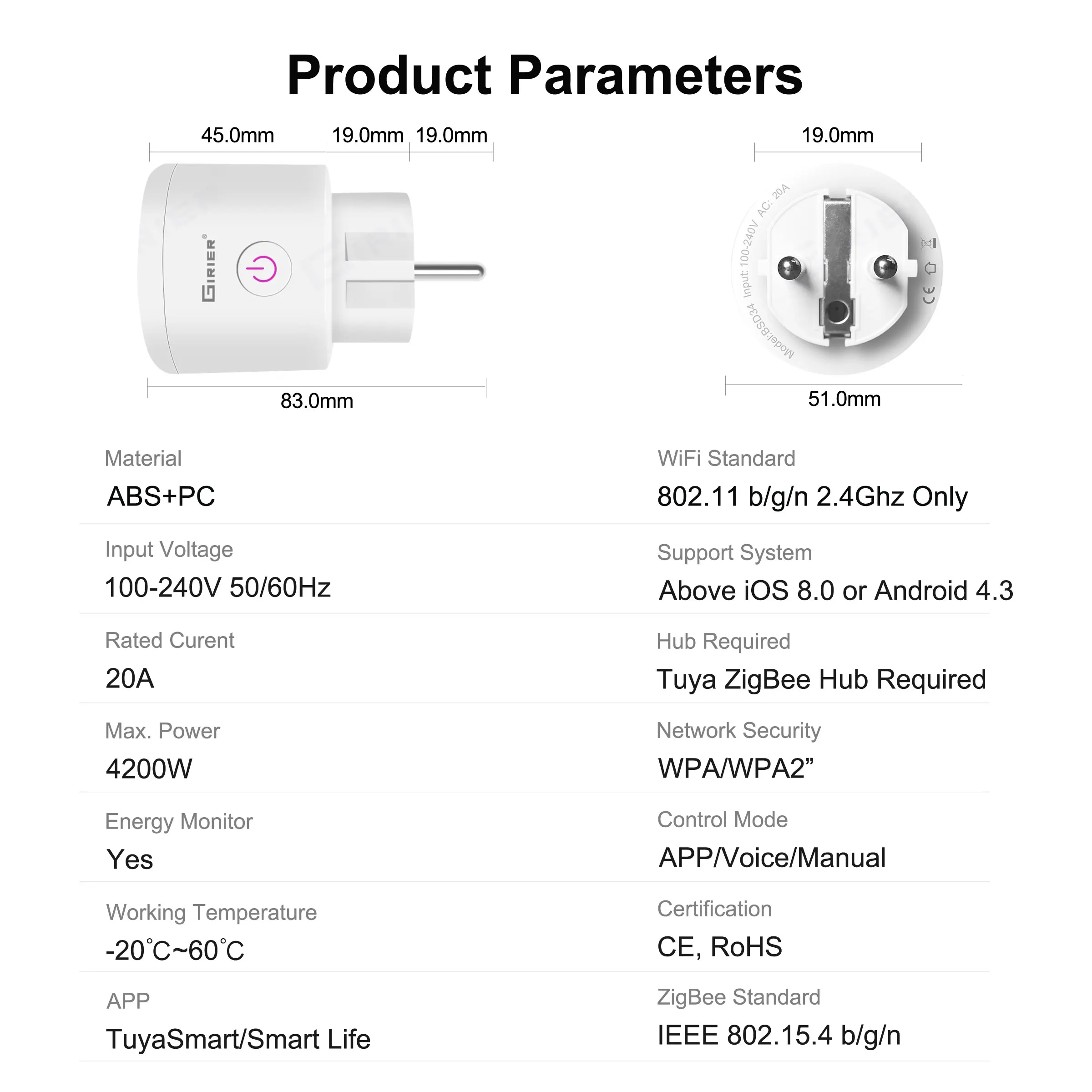 ปลั๊กไฟอัจฉริยะ GIRIER Tuya ZigBee 20A สำหรับบ้านอัจฉริยะ รองรับมาตรฐาน EU 4200W พร้อมฟังก์ชั่นตรวจสอบพลังงาน ใช้งานร่วมกับ Alexa และ Google Home ได้