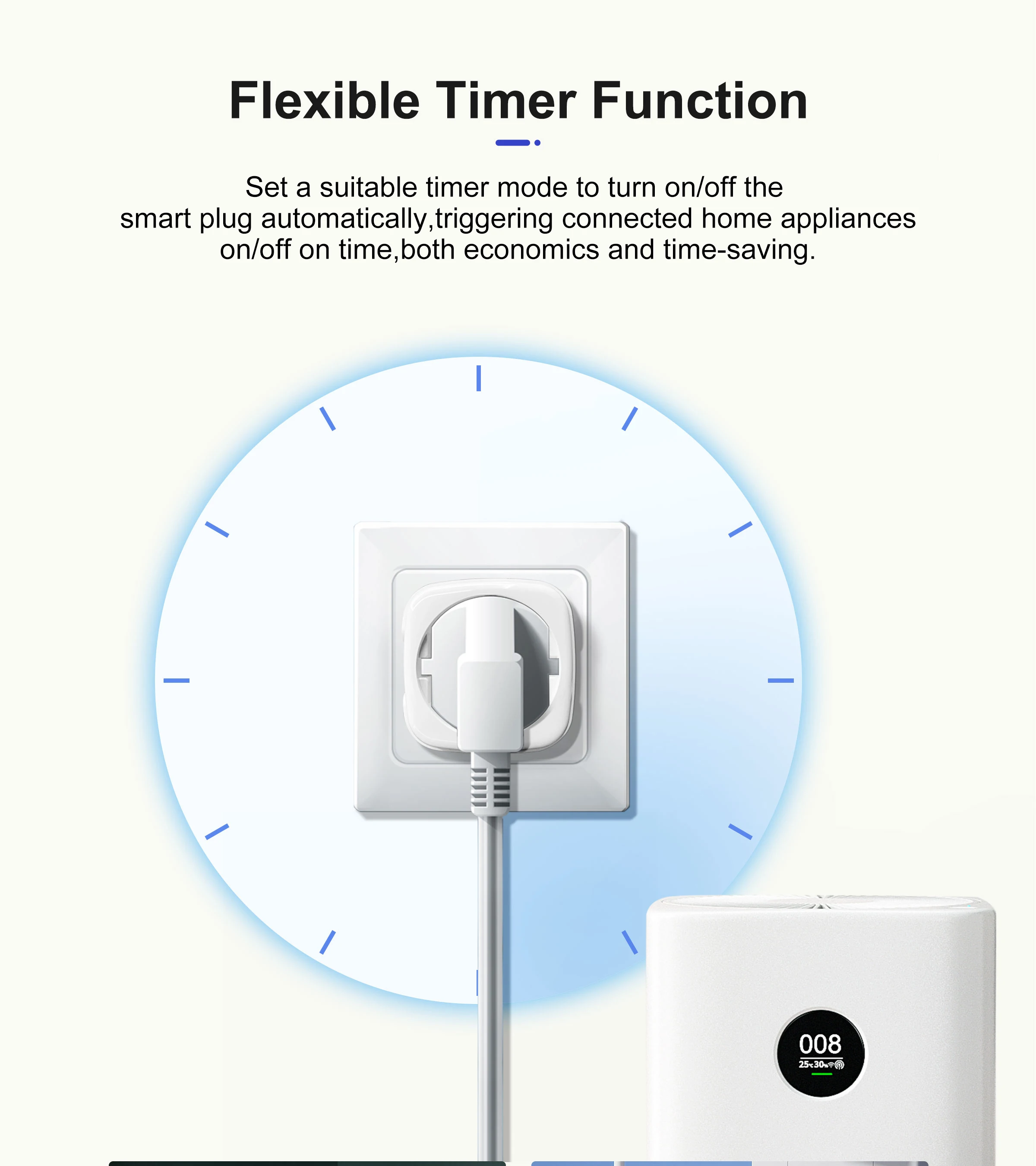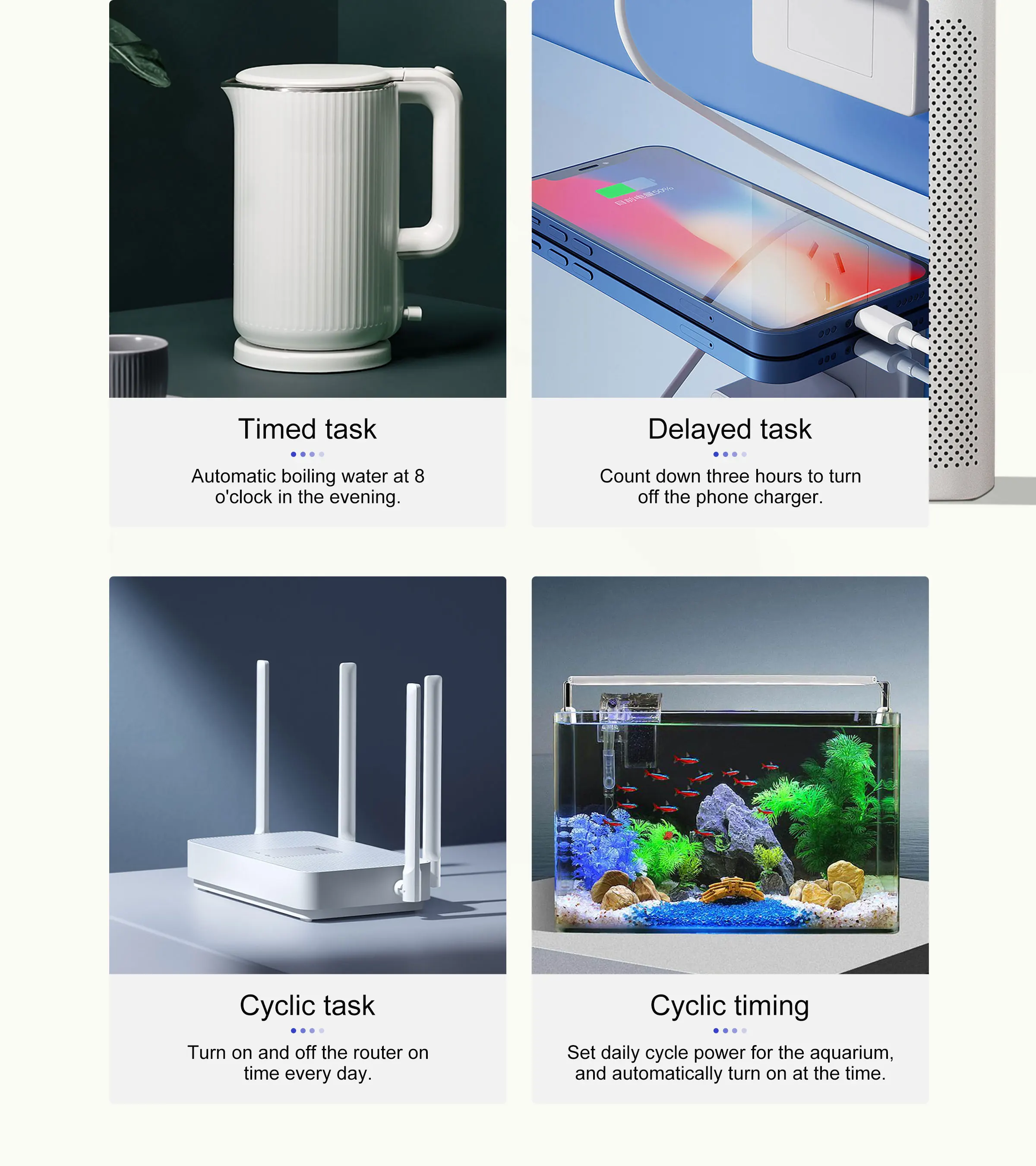สามารถตั้งค่าโหมดตัวจับเวลาได้หลายแบบเพื่อตอบสนองความต้องการของคุณกำหนดตารางเวลาที่เหมาะสมเพื่อกระตุ้นอุปกรณ์ที่เชื่อมต่อกับปลั๊กอัจฉริยะให้ตรงเวลา ทั้งประหยัดพลังงานและประหยัดเวลา