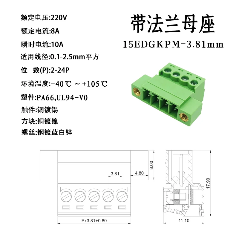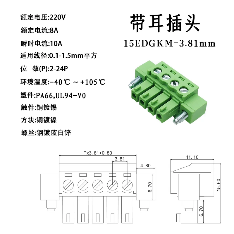 บัดกรีฟรี 15EDGRKP-3.81mm Plug-in Terminal Air Docking พร้อมหูสกรูยึด 2EDGRKP 2P3P4P5P6P-24P Phoenix Terminal CONNECTOR