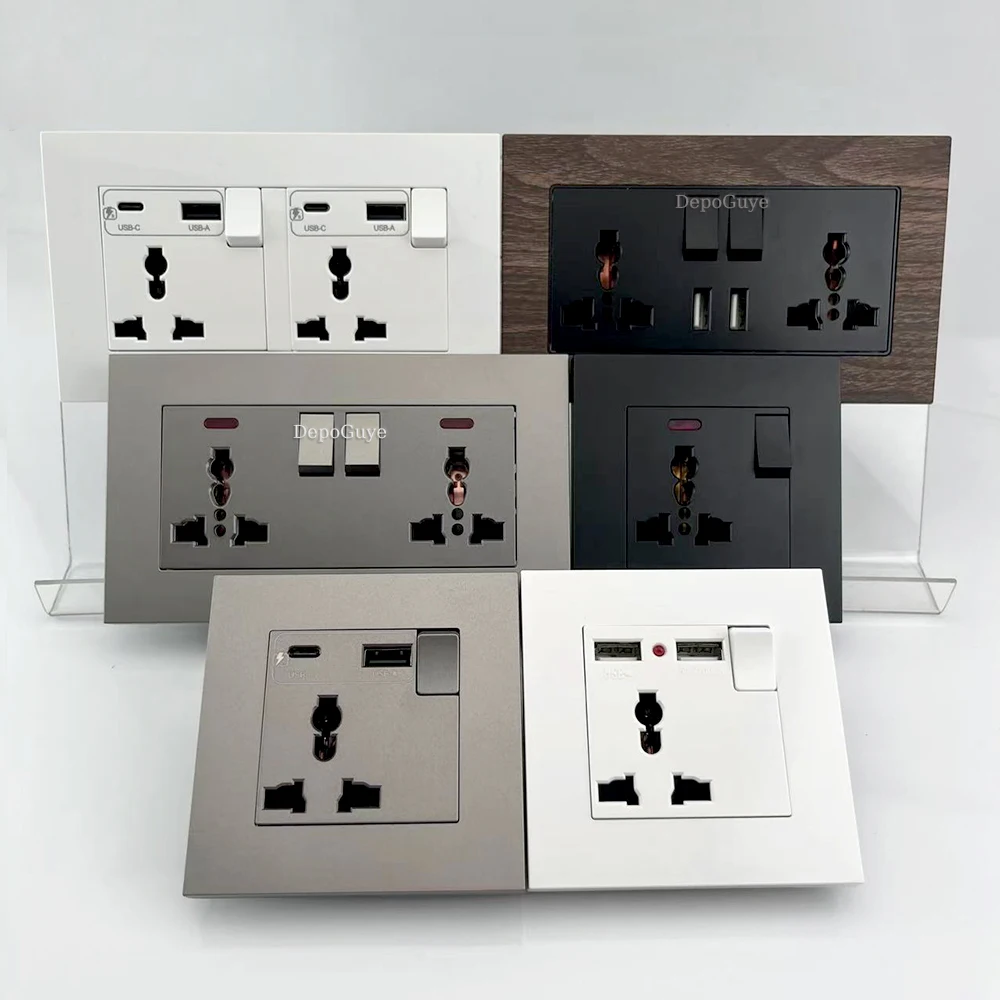 เต้ารับติดผนังแบบ 86 พร้อมการชาร์จเร็ว USB-C | ปลั๊กไฟแบบหลายพอร์ต 5-in-1 | แผงไฟฟ้าติดผนังแบบโมเดิร์น 110~250V สำหรับบ้านและสำนักงาน