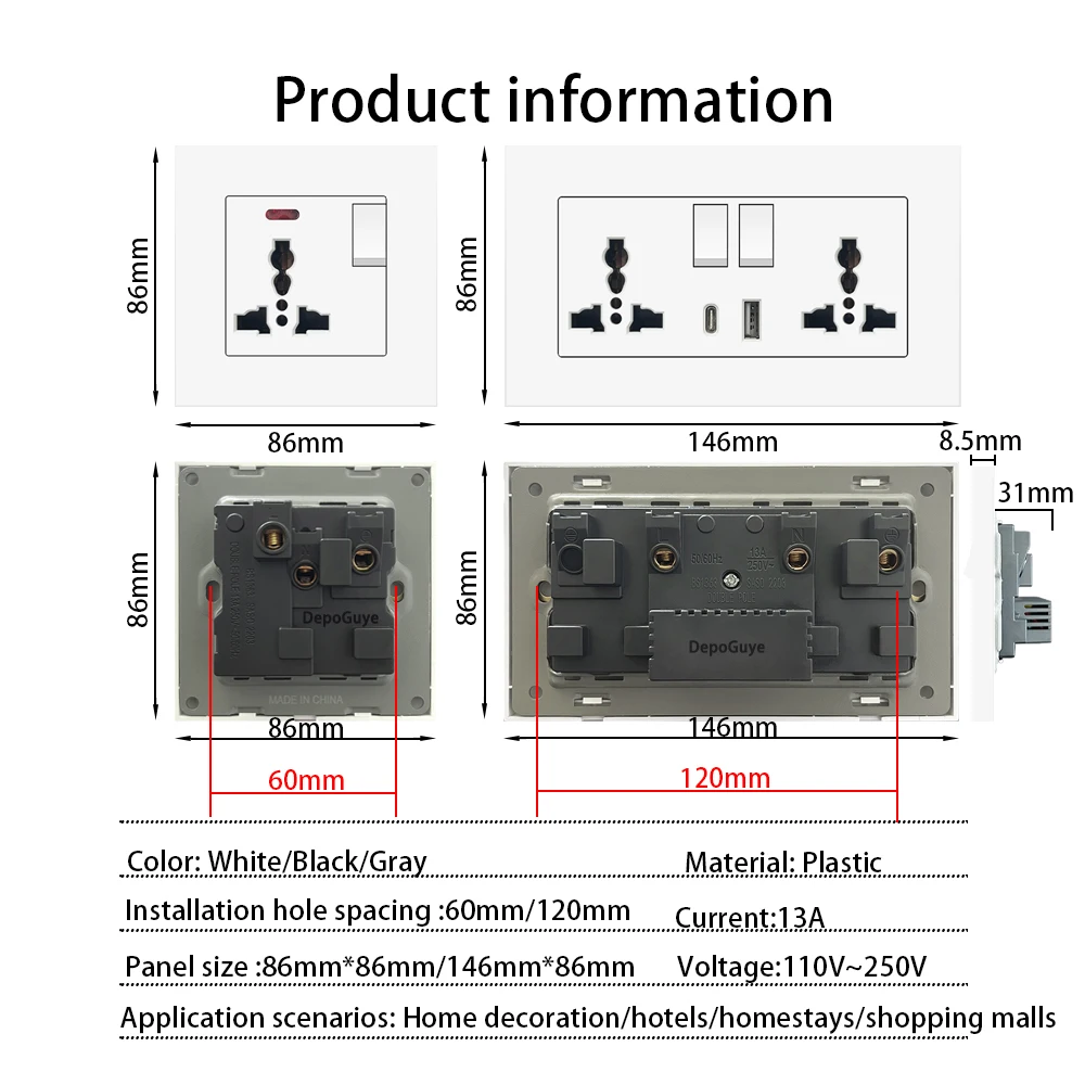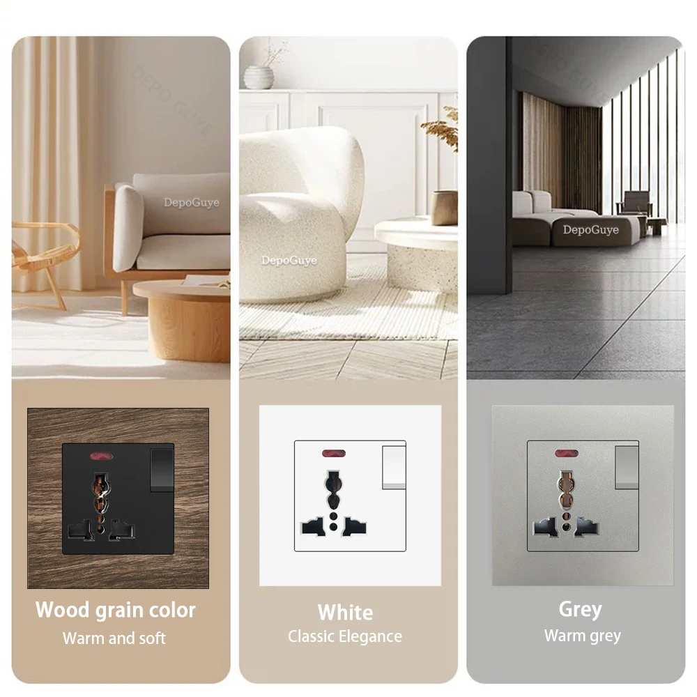 เต้ารับติดผนังแบบ 86 พร้อมการชาร์จเร็ว USB-C | ปลั๊กไฟแบบหลายพอร์ต 5-in-1 | แผงไฟฟ้าติดผนังแบบโมเดิร์น 110~250V สำหรับบ้านและสำนักงาน