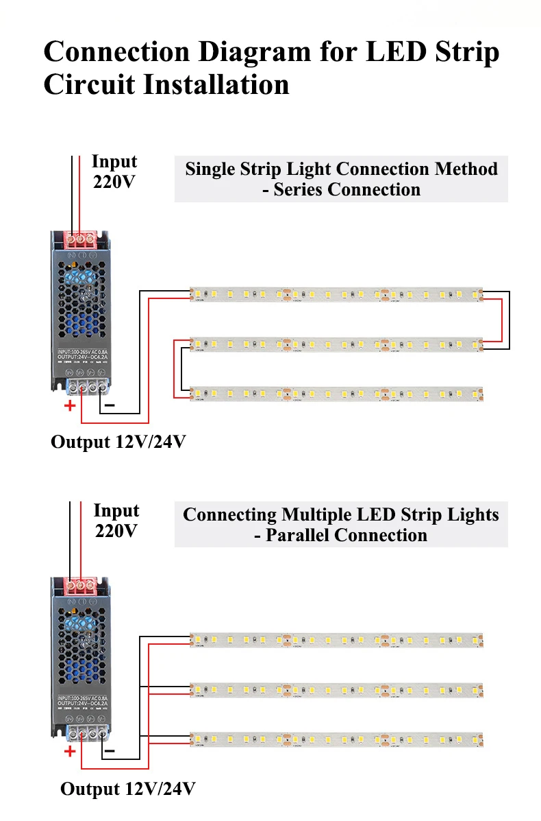 มีจำหน่ายในรุ่น 12V และ 24V DC พร้อมอินพุต AC ตั้งแต่ 220V หม้อแปลงนี้รองรับความต้องการของไฟแถบ LED ที่หลากหลาย
