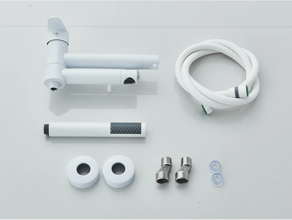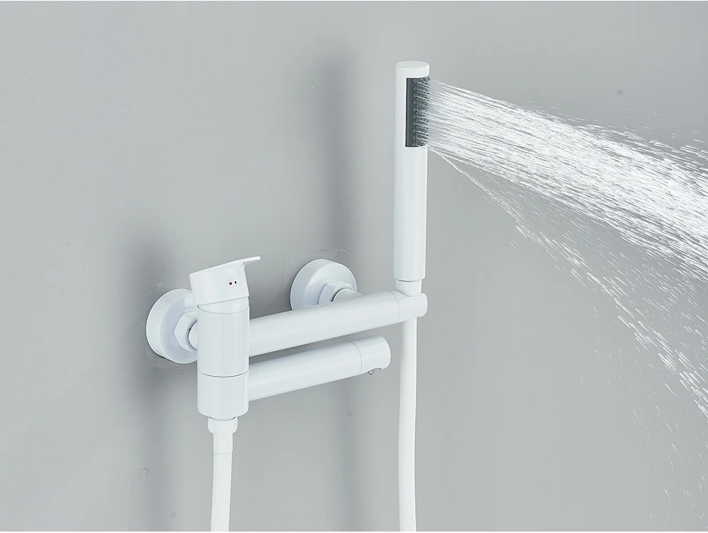 ครีมสีขาว/สีเทาห้องน้ําน้ําตกอ่างอาบน้ําก๊อกน้ําพร้อมหัวฝักบัวมือถือติดผนังร้อนและเย็นแตะชุดฝักบัว
