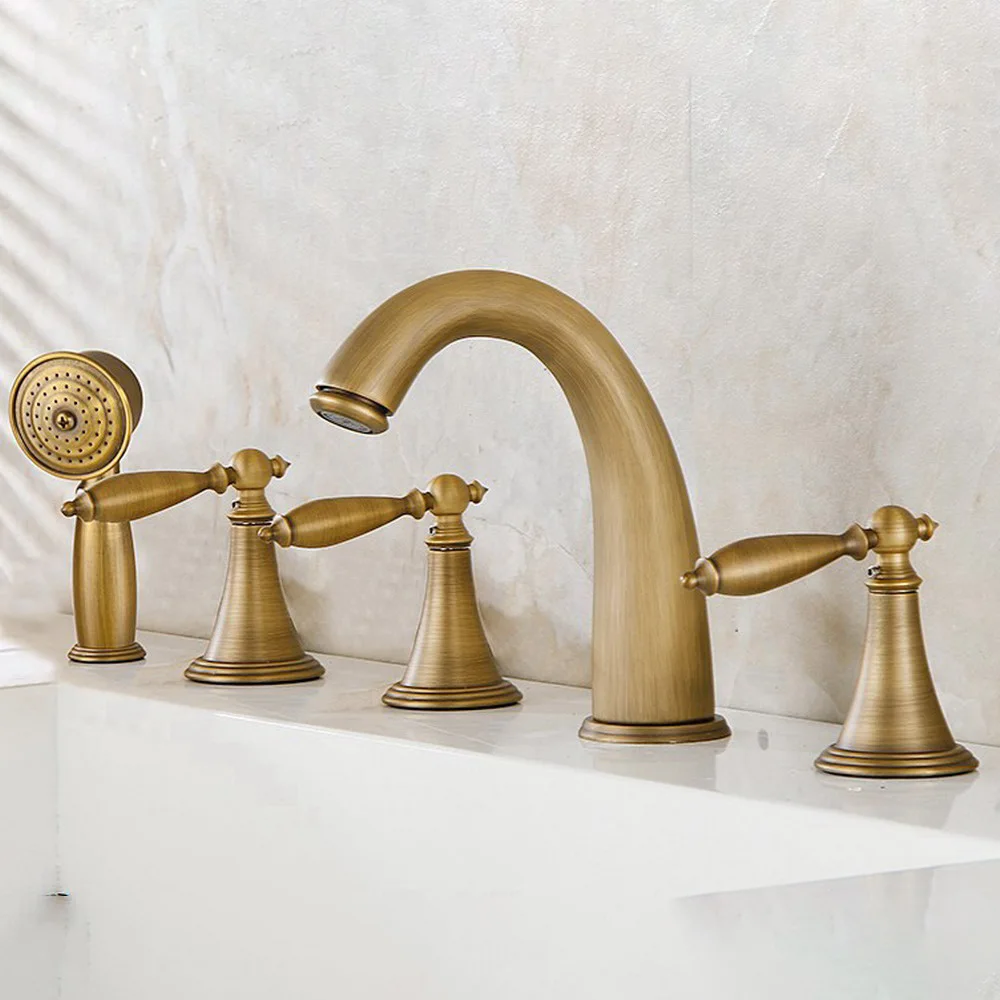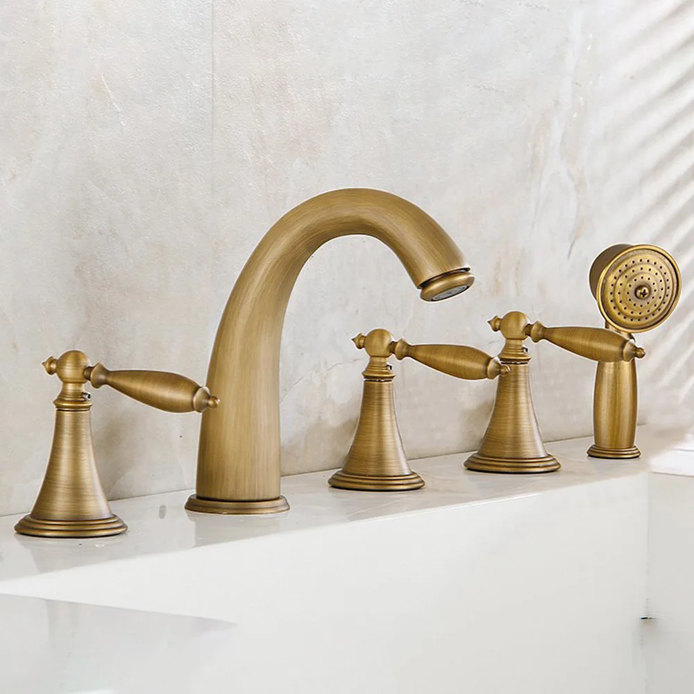 ทองเหลืองโบราณดาดฟ้าติดตั้ง 5PCS ก๊อกน้ําห้องน้ําอ่างอาบน้ําอ่างล้างหน้าแตะน้ําร้อนเย็นก๊อกสามจับ Ntf036