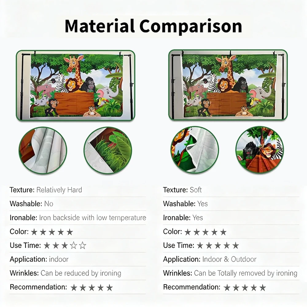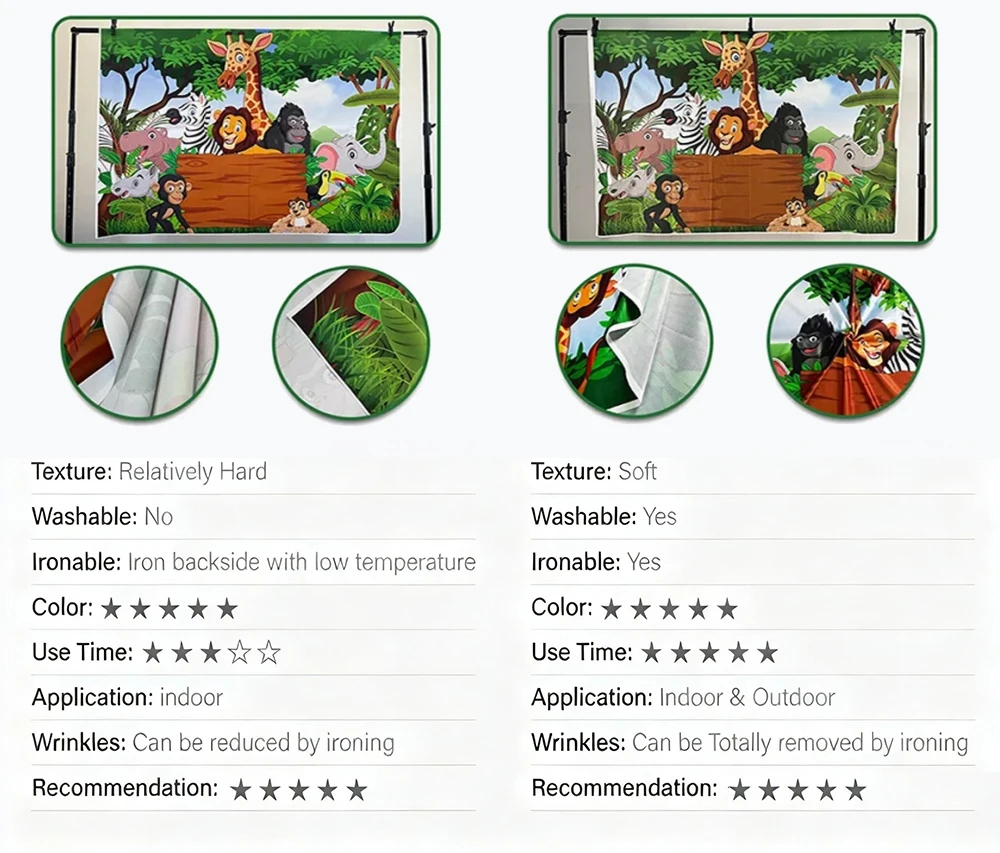 วัสดุไวนิลมีน้ำหนักเบาและพกพาได้ มอบประสบการณ์การรับชมภาพที่มีความละเอียดสูงพร้อมเอฟเฟ็กต์สมจริงอย่างไรก็ตาม มันมีแนวโน้มที่จะเกิดริ้วรอย สีซีดจาง และเปลี่ยนสีเมื่อสัมผัสกับแสงแดดไม่ทนความร้อน ซักด้วยเครื่องซักผ้าได้ หรือกันน้ำได้ จึงเหมาะสำหรับการใช้งานเพียงครั้งเดียวมากกว่า