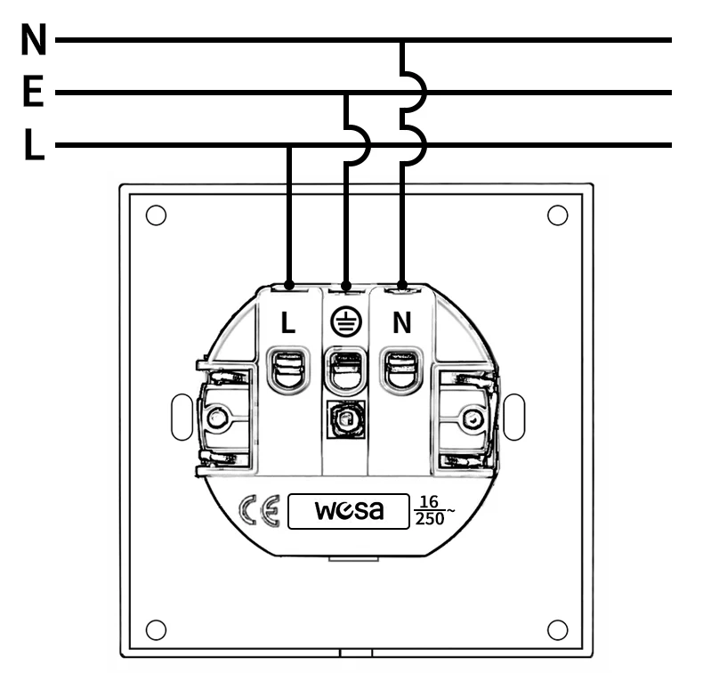 N คือสายศูนย์, L คือสายไฟฟ้ากระแสสลับ, และ E คือสายดิน กรุณาเชื่อมต่อสายไฟตามแผนภาพ