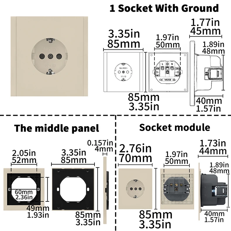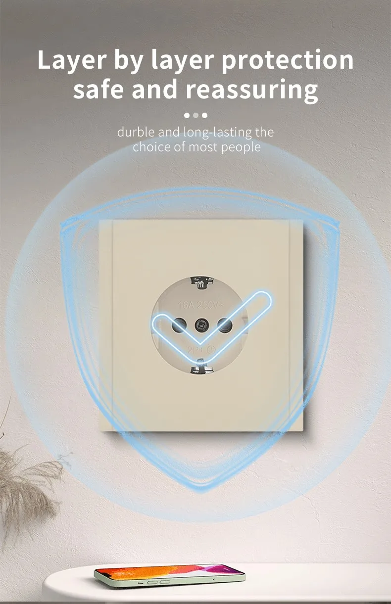 Wesa ซ็อกเก็ตฝังผนังสีทองหน้าจอโทรศัพท์นิรภัยคริสตัลเทมเปอร์ปลั๊กไฟฟ้าที่มีสารหน่วงไฟบนพื้นดิน