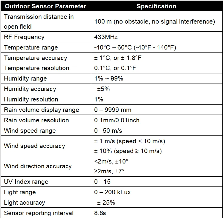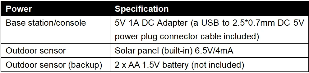 หมายเหตุ: แหล่งพลังงานหลักสำหรับเซ็นเซอร์กลางแจ้งคือแผงโซลาร์เซลล์ เมื่อพลังงานแสงอาทิตย์ที่มีอยู่ไม่เพียงพอ แบตเตอรี่จะถูกใช้ ในสภาพอากาศกลางแจ้งที่มีอุณหภูมิต่ำกว่า 0 บ่อยครั้ง ° ซี (หรือ 32 ° F) แนะนำให้ใช้แบตเตอรี่ลิเธียมอย่างยิ่ง เนื่องจากแบตเตอรี่เหล่านี้ทำงานได้ดีกว่าแบตเตอรี่อัลคาไลน์ภายใต้สถานการณ์ดังกล่าว