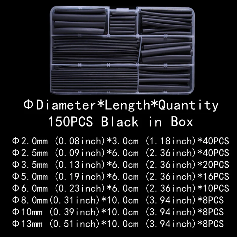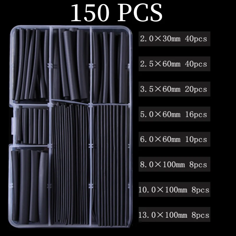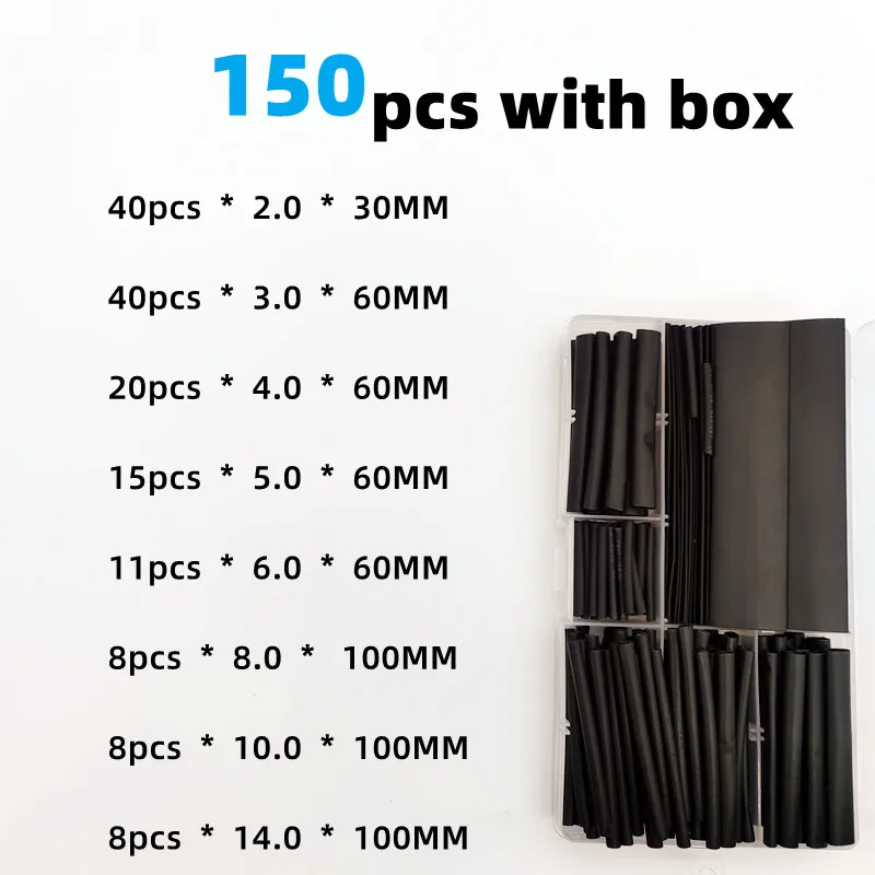 ชุดปลอกหดความร้อน150ชิ้นสีดำบรรจุกล่อง2:1ๆครั้งชุดท่อทนความร้อนของตกแต่งงานปาร์ตี้