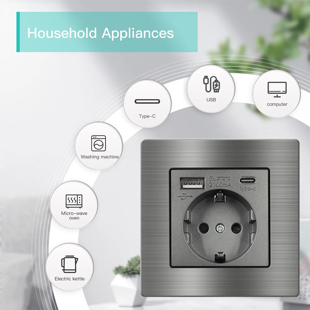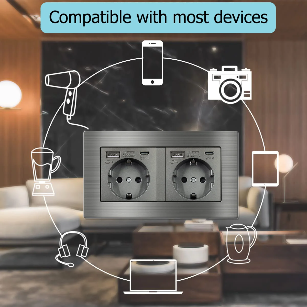 EU มาตรฐานคู่ USB Wall Power Socket, ซ็อกเก็ตไฟฟ้าปลั๊กผนัง Type-c Usb Fast Charing พอร์ต 16A PC แผง Outlet 220V