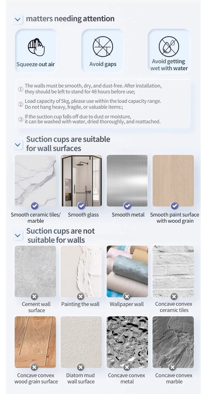 6.เมื่อติดตั้งถ้วยดูด โปรดตรวจสอบให้แน่ใจว่าถ้วยดูดและผนังสะอาดในขณะเดียวกันผนังต้องเรียบและเรียบเนียน 100% ไม่มีรอยแตกร้าว รู หรือสภาวะอื่นๆ