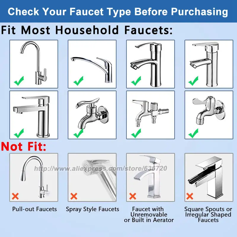 ขั้นแรก ตรวจสอบ faucet และอุปกรณ์เสริมของคุณอย่างรอบคอบเพื่อให้แน่ใจว่าเข้ากันได้ ด้วยอะแดปเตอร์เกลียวภายในและภายนอกที่ให้มาซึ่งมีเส้นผ่านศูนย์กลางตั้งแต่ 19.5 มม. ถึง 23.5 มม. faucet เกือบทุกชนิดจึงสามารถใช้งานร่วมกันได้ สําหรับก๊อกน้ําที่มีเส้นผ่านศูนย์กลางเกลียว M22 (21.5 มม.) หรือ M24 (23.5 มม.) ให้ใช้อะแดปเตอร์เกลียวภายใน Type A สําหรับก๊อกน้ําที่มีเส้นผ่านศูนย์กลาง M20 (20.5 มม.), M22 (21.0 มม.) หรือ M24 (22.5 มม.) ให้ใช้อะแดปเตอร์เกลียวภายนอก Type B
