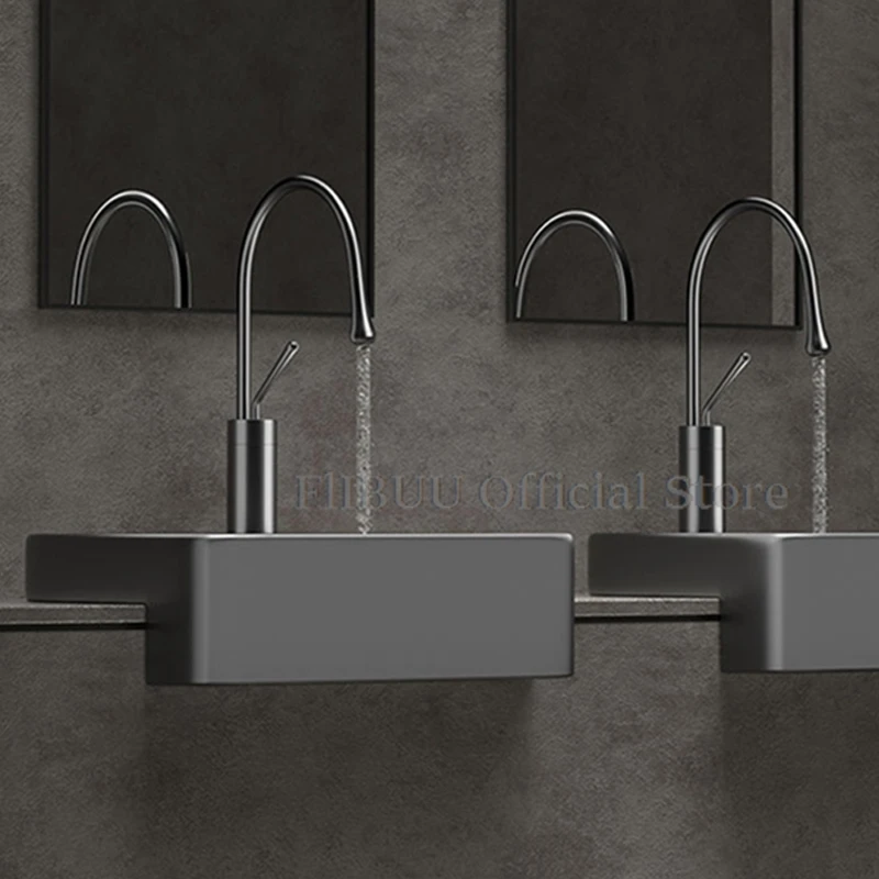 ก๊อกน้ําห้องน้ําทองเหลืองสีดําโต๊ะส้วมล้างมือทรงกลมภายใต้ก๊อกน้ําร้อนและเย็นของโรงแรมระดับไฮเอนด์