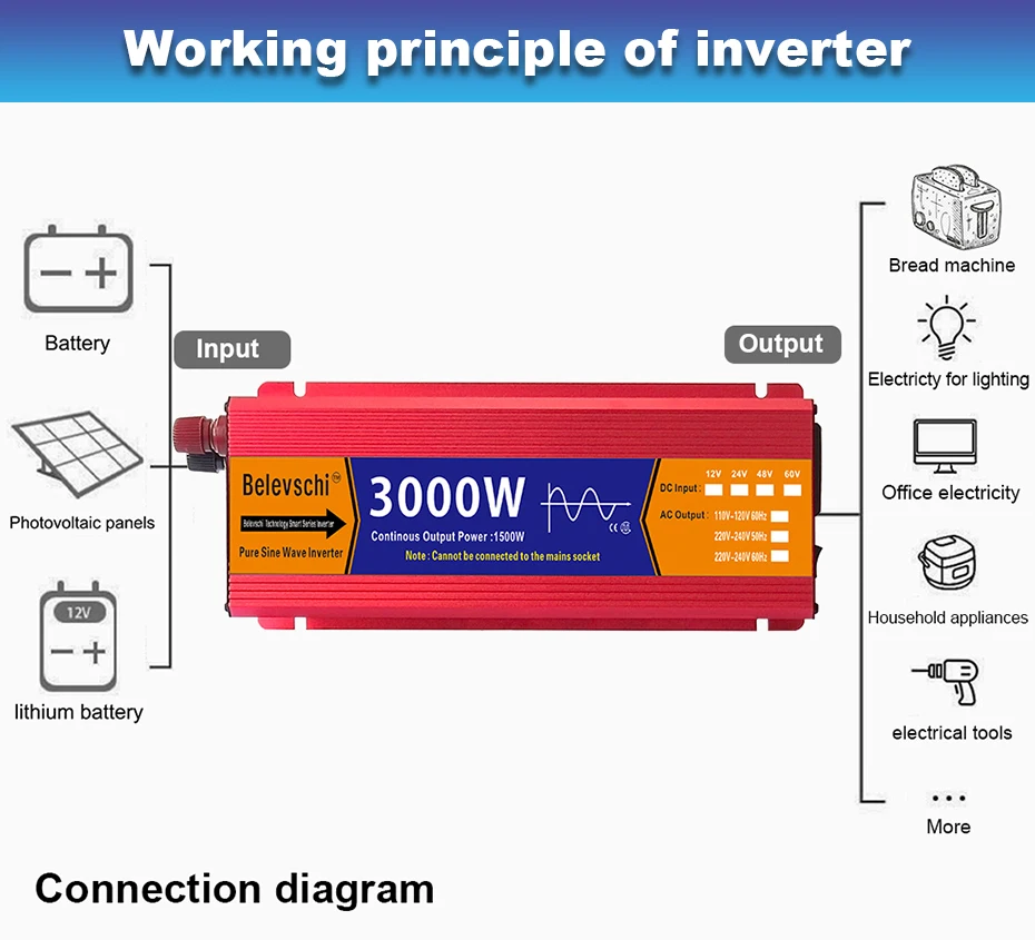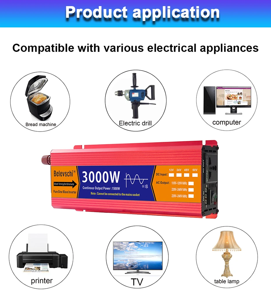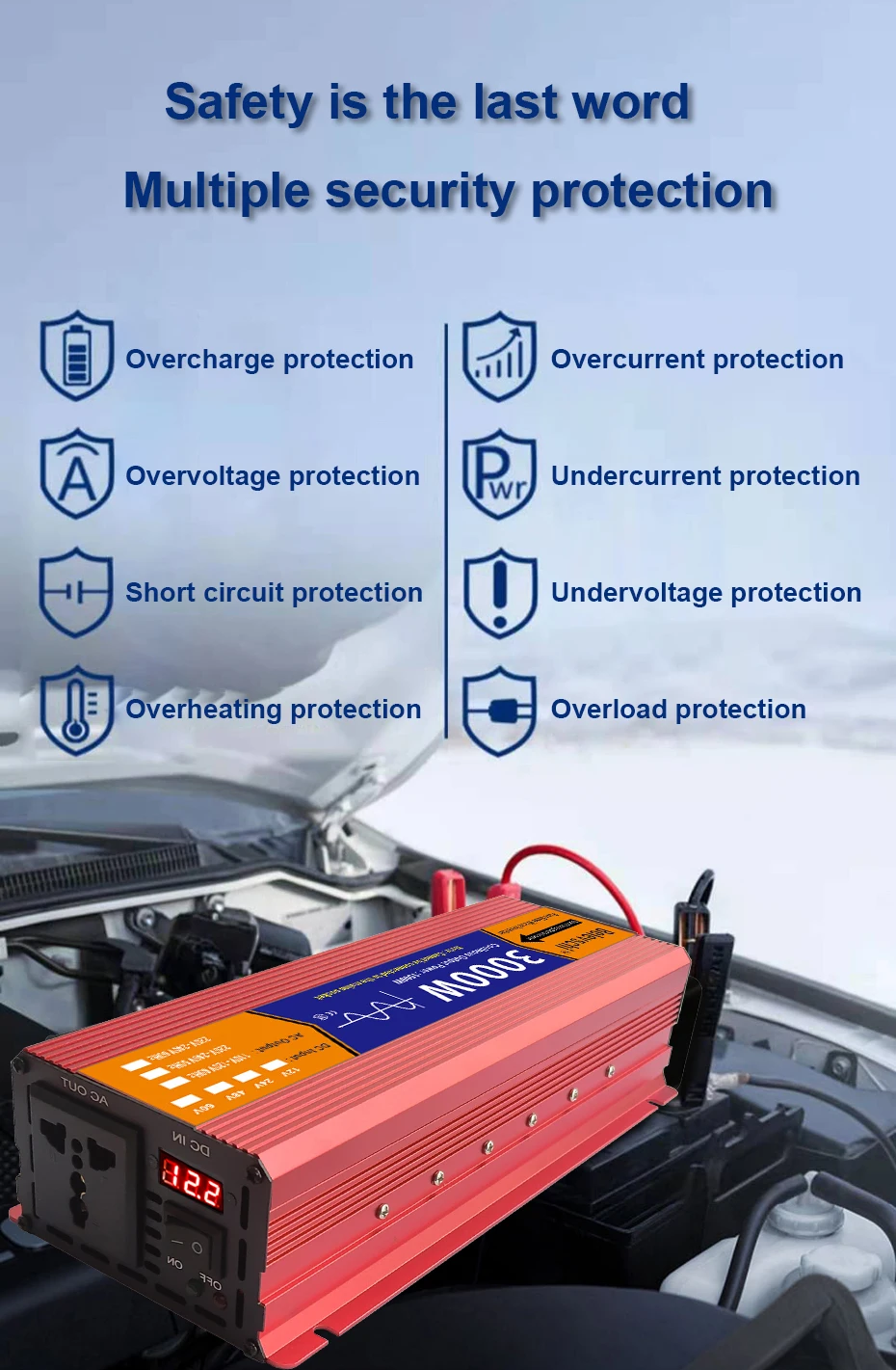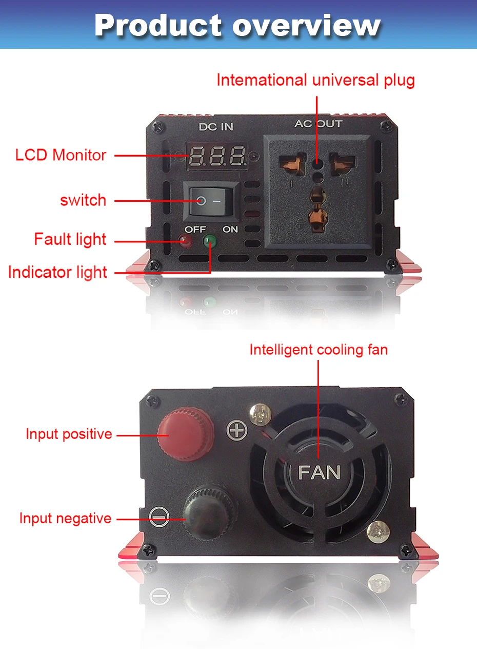 2: Pure sine wave, intelligent filter, does not interfere with electrical appliances, protects electrical appliances. With high conversion efficiency (up to 95%), the low power consumption of the product itself can greatly extend battery life.