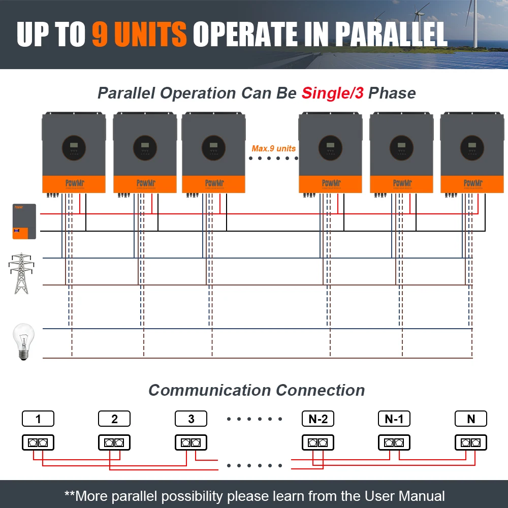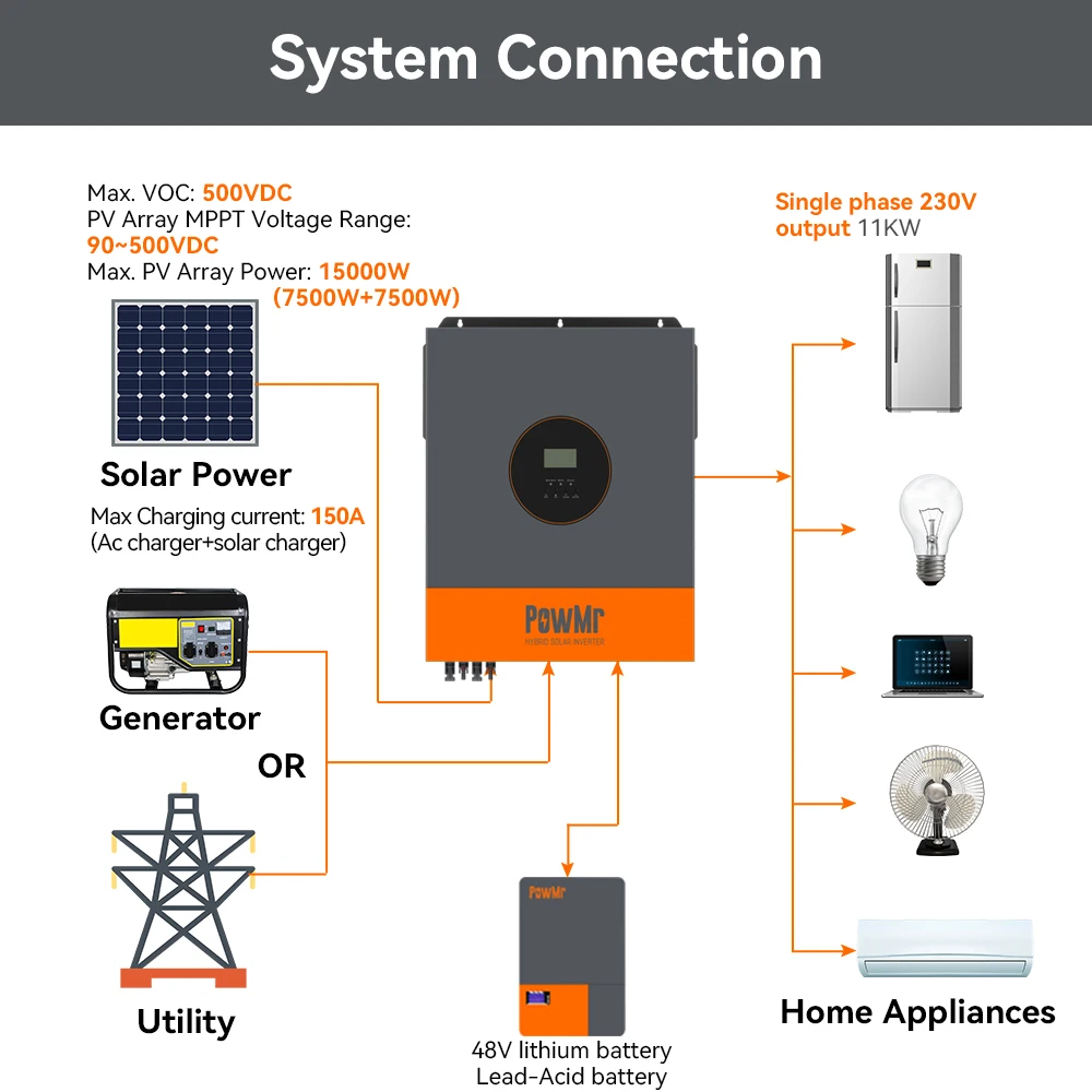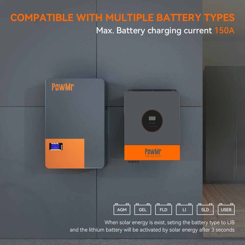 PowMr อินเวอร์เตอร์พลังงานแสงอาทิตย์แบบไฮบริด 11KW 48V 220V Off Grid พร้อม MPPT 150A เครื่องชาร์จทำงานโดยไม่มีแบตเตอรี่ขนานสูงสุด 9 ยูนิต
