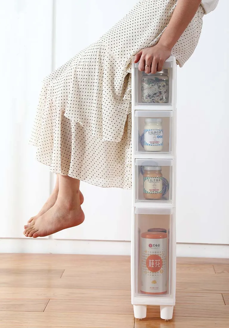 ตู้เก็บของแบบพับได้ โปร่งใส บางเฉียบ พร้อมล้อ กันน้ำ กันฝุ่น ประหยัดพื้นที่ สำหรับจัดระเบียบห้องน้ำ ห้องครัว